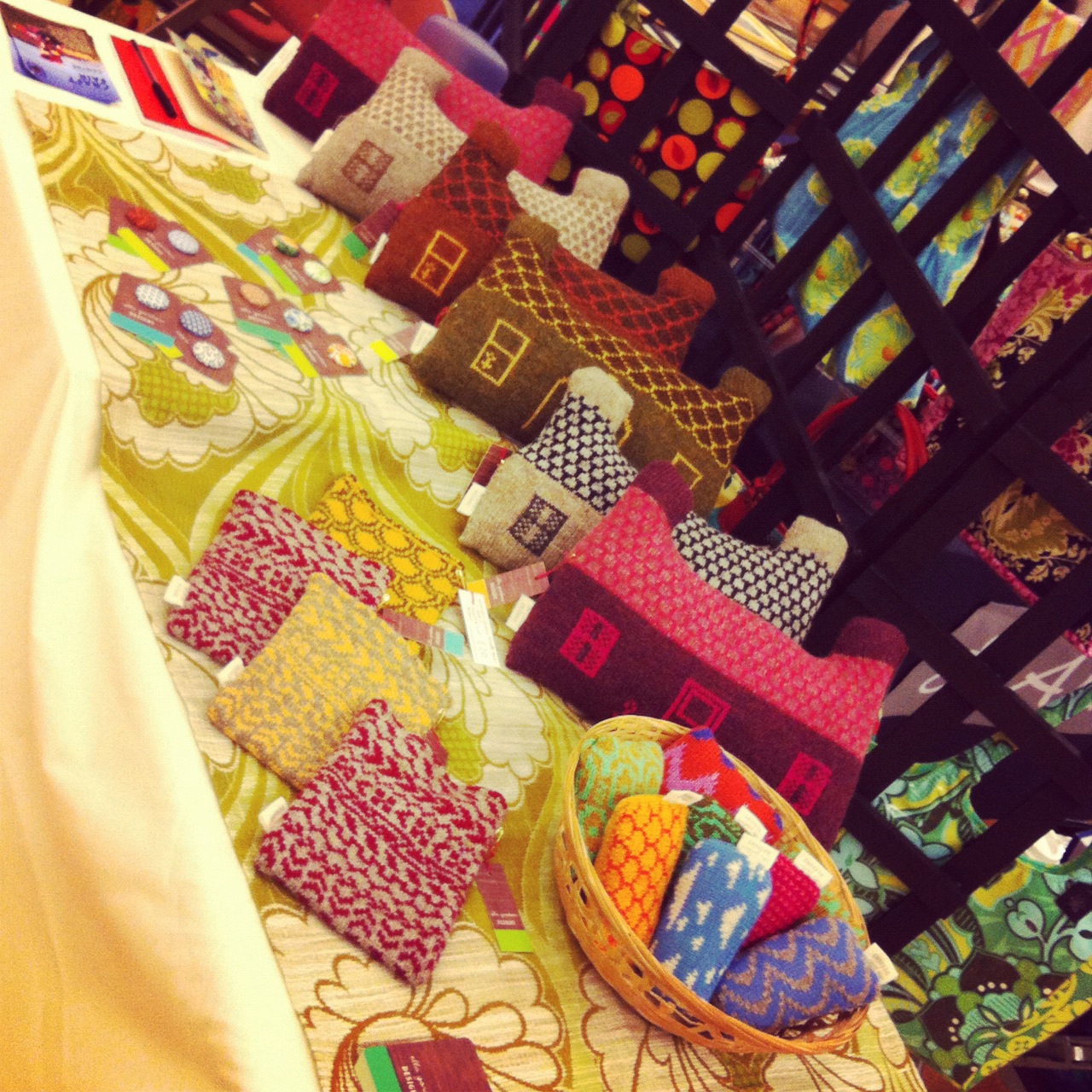 i had a great spot, directly across from the entrance. i had put a lot of thought into my products but not a lot of thought into the space i would have.. so when i arrived on Friday i was a bit.. perplexed at where to start. Thankfully i had my mam with me and she scooted off back home (twice) to get more things to add to my table.. like my vintage duvet cover (bought from a charity shop) and one of the chairs i covered for my degree show. And that fabric you see on the table under the cushions is taken from my Granny and Grandads in Ollaberry. It used to be an old curtain :)