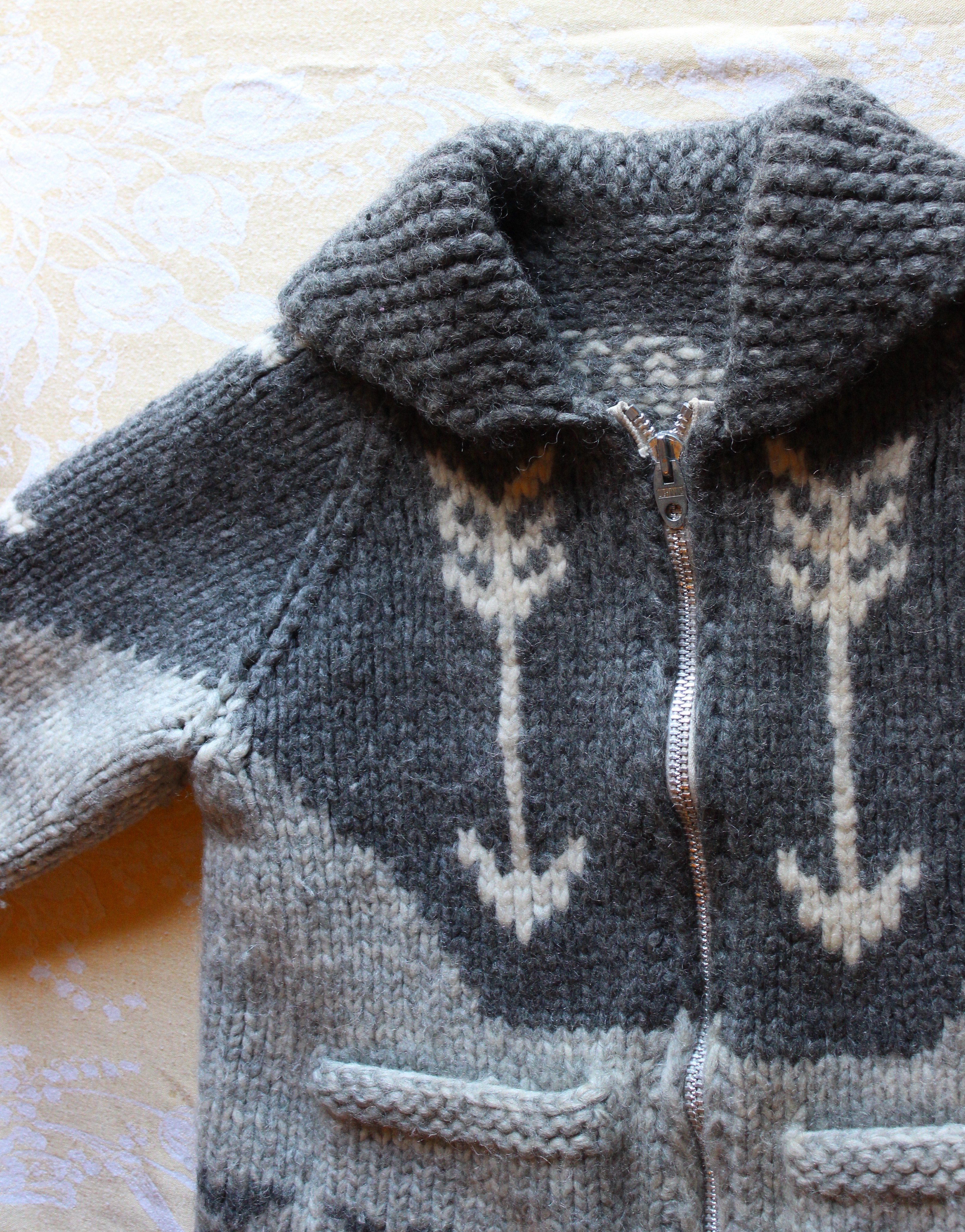This is so great! My dad has a big Cowichan sweater (not a cardigan) that he bought in Alberta. He wears it cross country skiing in the winter and my mum knit him a matching hat.