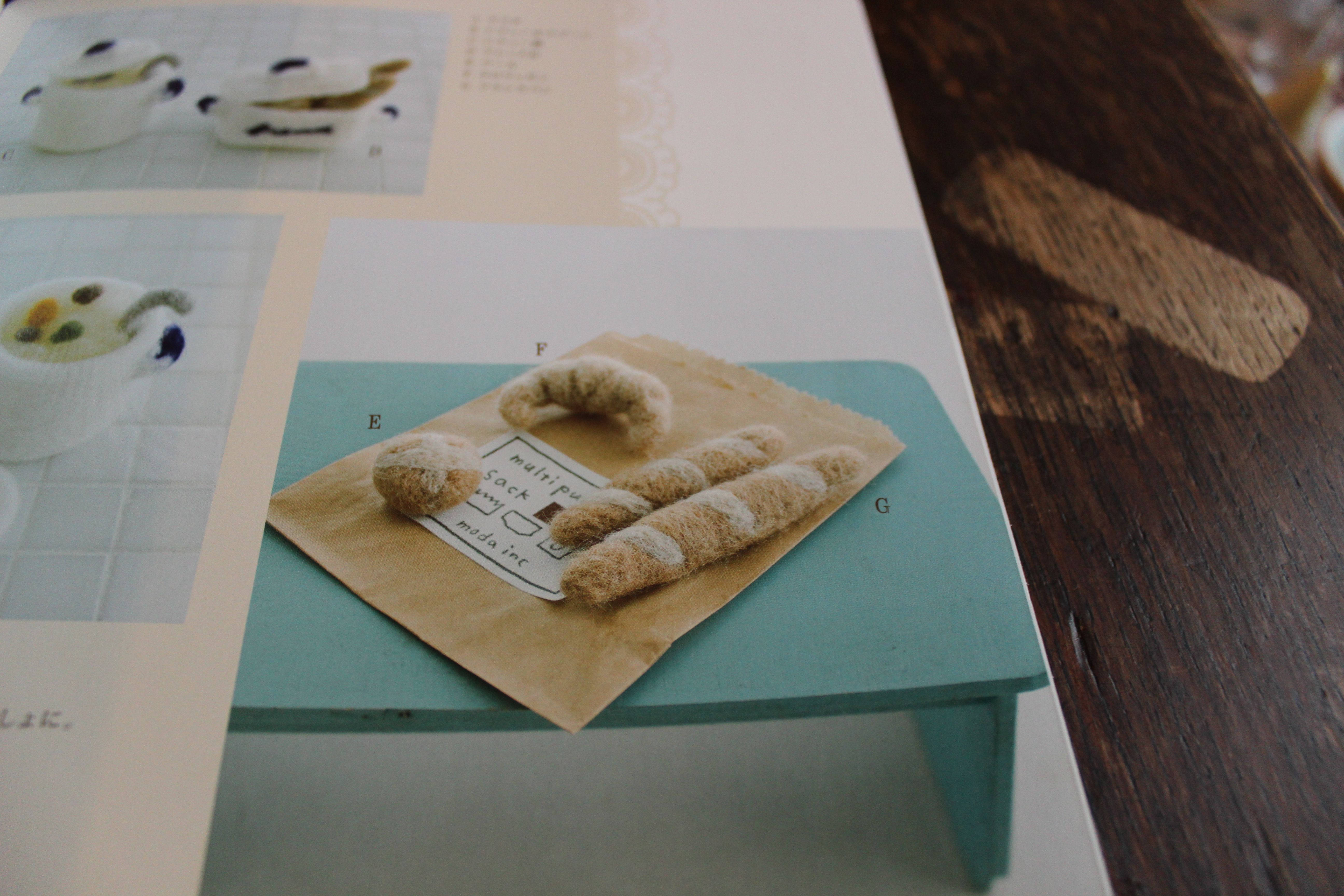 This book was an impulse purchase.. really i just thought it looked cute. I have dabbled (pardon the pun) in the idea of taking up needle felting.. as if i need another hobby.. but the pictures in the book are really cute and of course the layouts and set ups are very inspirational