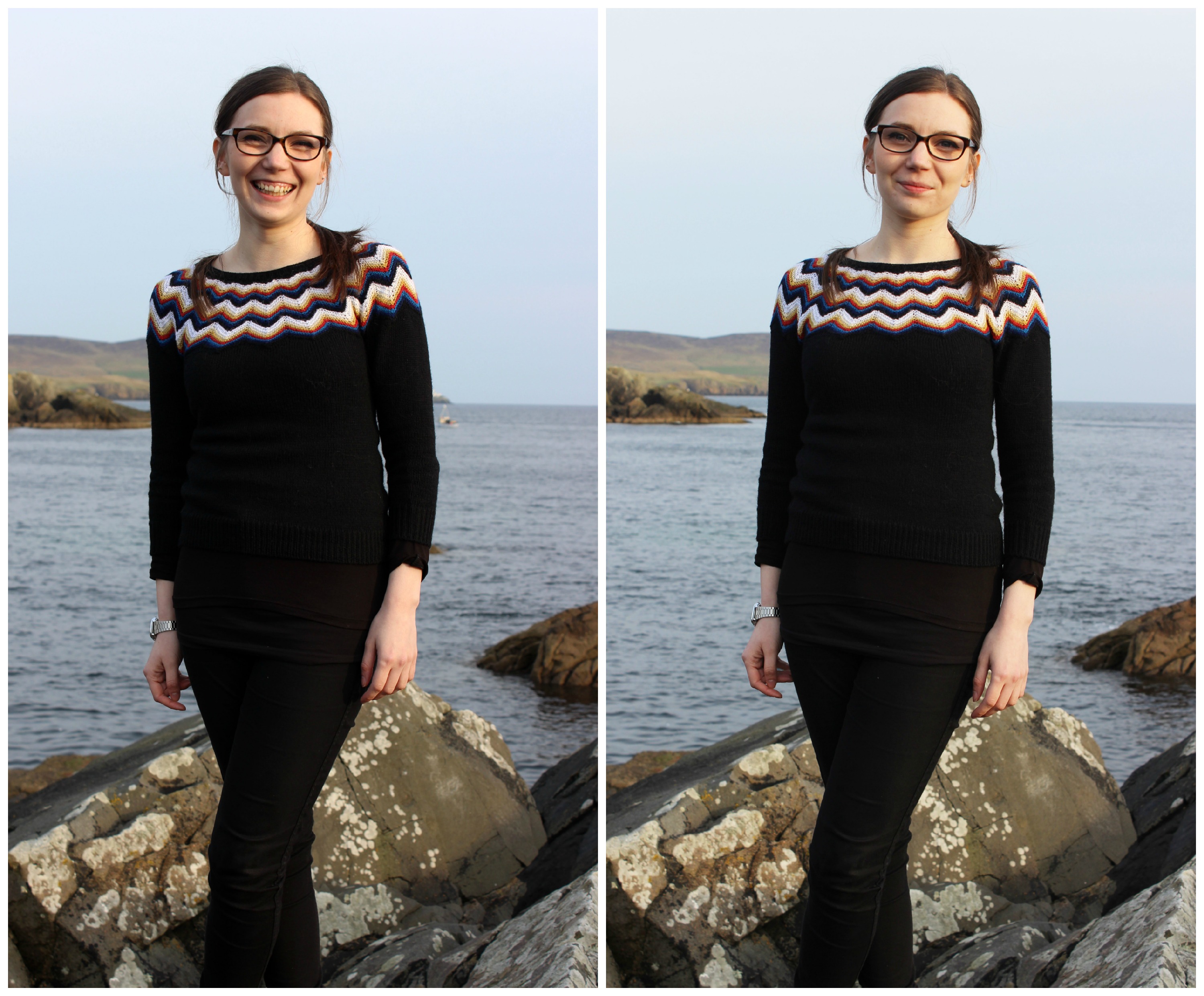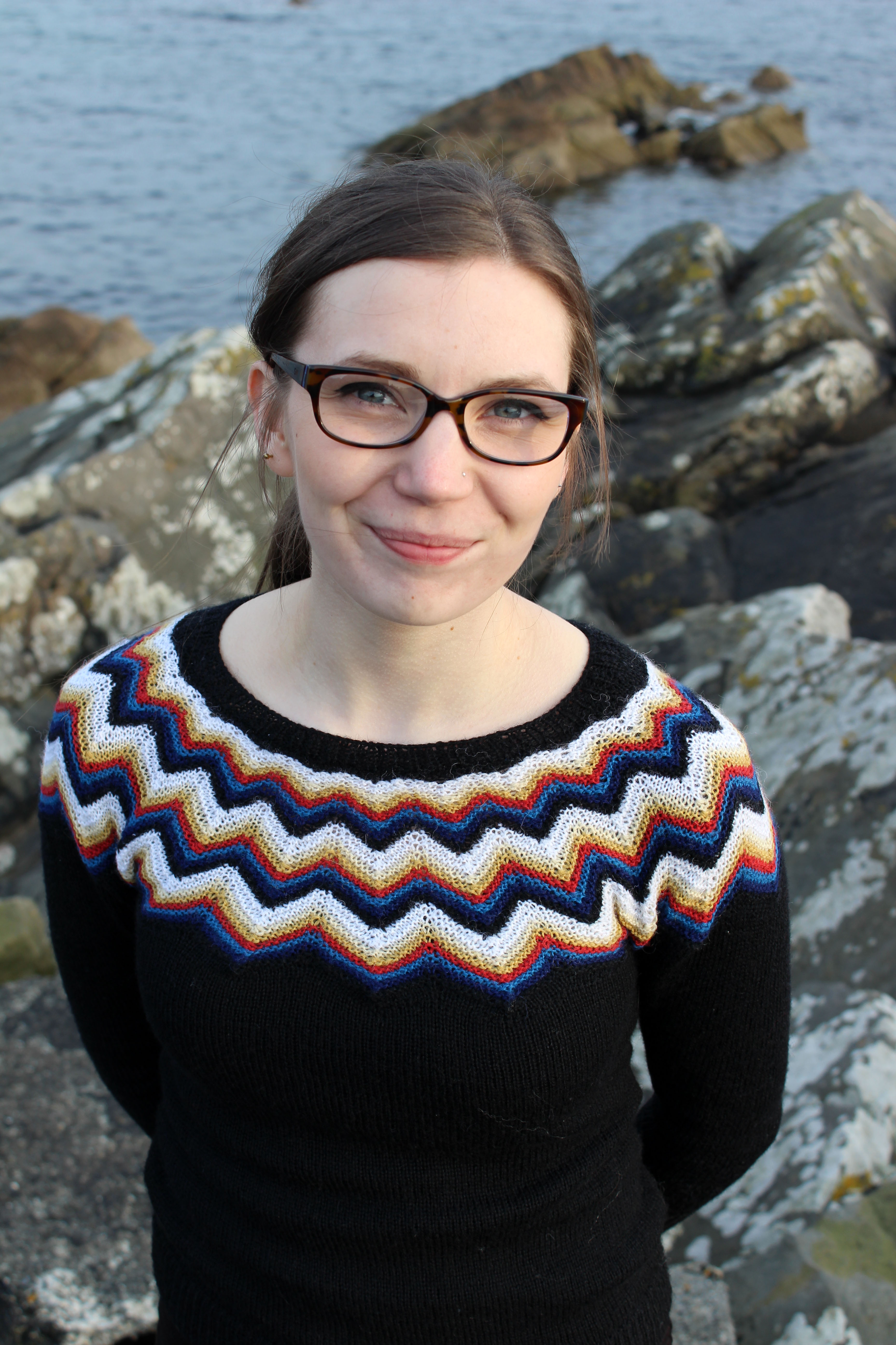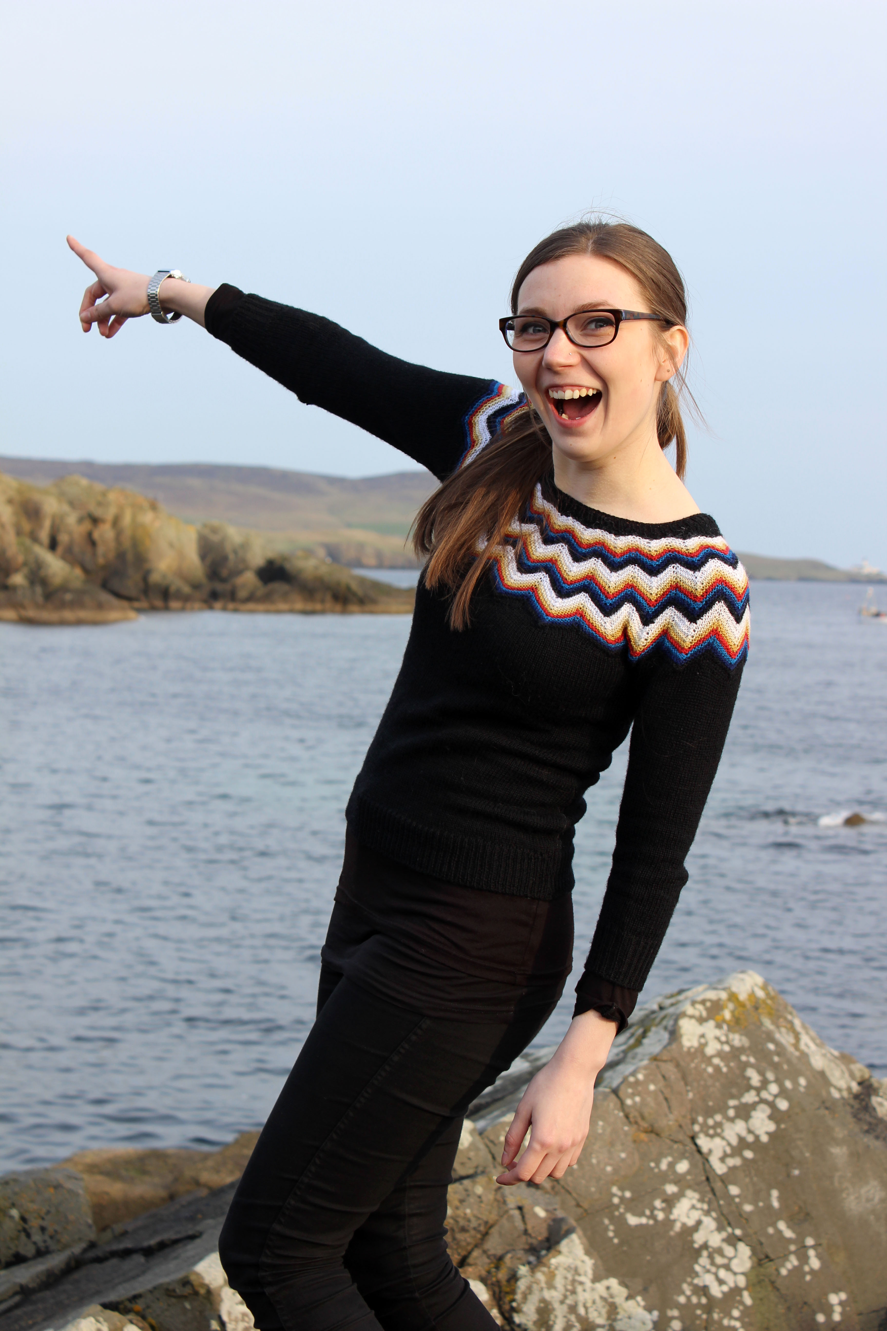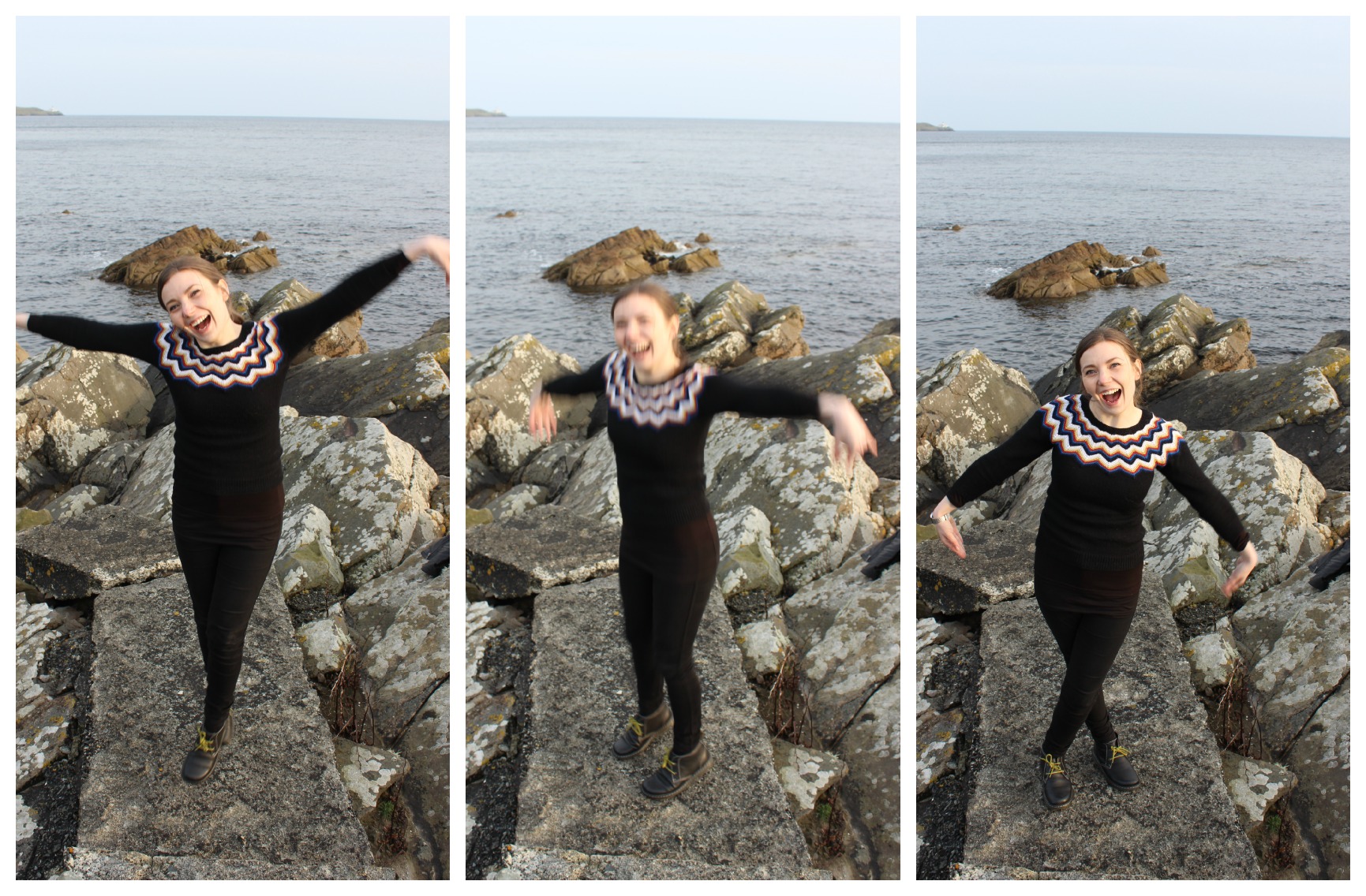 This is gorgeous! I love the shades you have chosen and the photos are wonderful! One of the thigns I love best about Kate’s patterns is how she connects playing in the landscape with designing garments. Your photos echo that spirit of play and make me want to book a flight to Shetland TODAY to go and spot puffins on Sumburgh Head, to skip around on the rocks by the water, and to knit with your yarns :D
