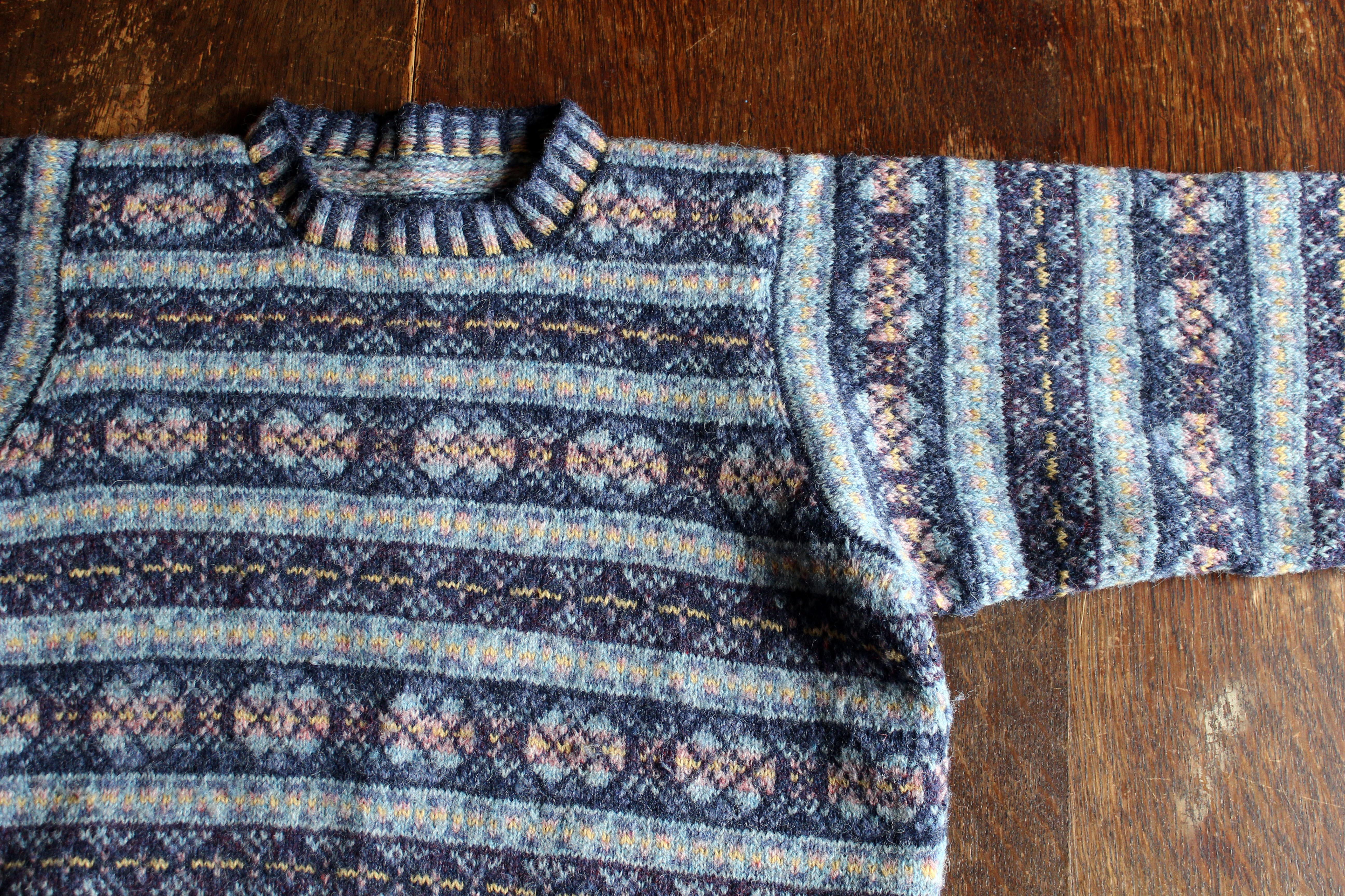 The two Fair Isle gansies were both purchased from the same person, the first one is a lovely blue and purpley all over which is make from the OXO Fair Isle pattern originally found in the Traditional Sweater Book by Madeline Weston (out of print but I got my copy for 1p on Amazon!)