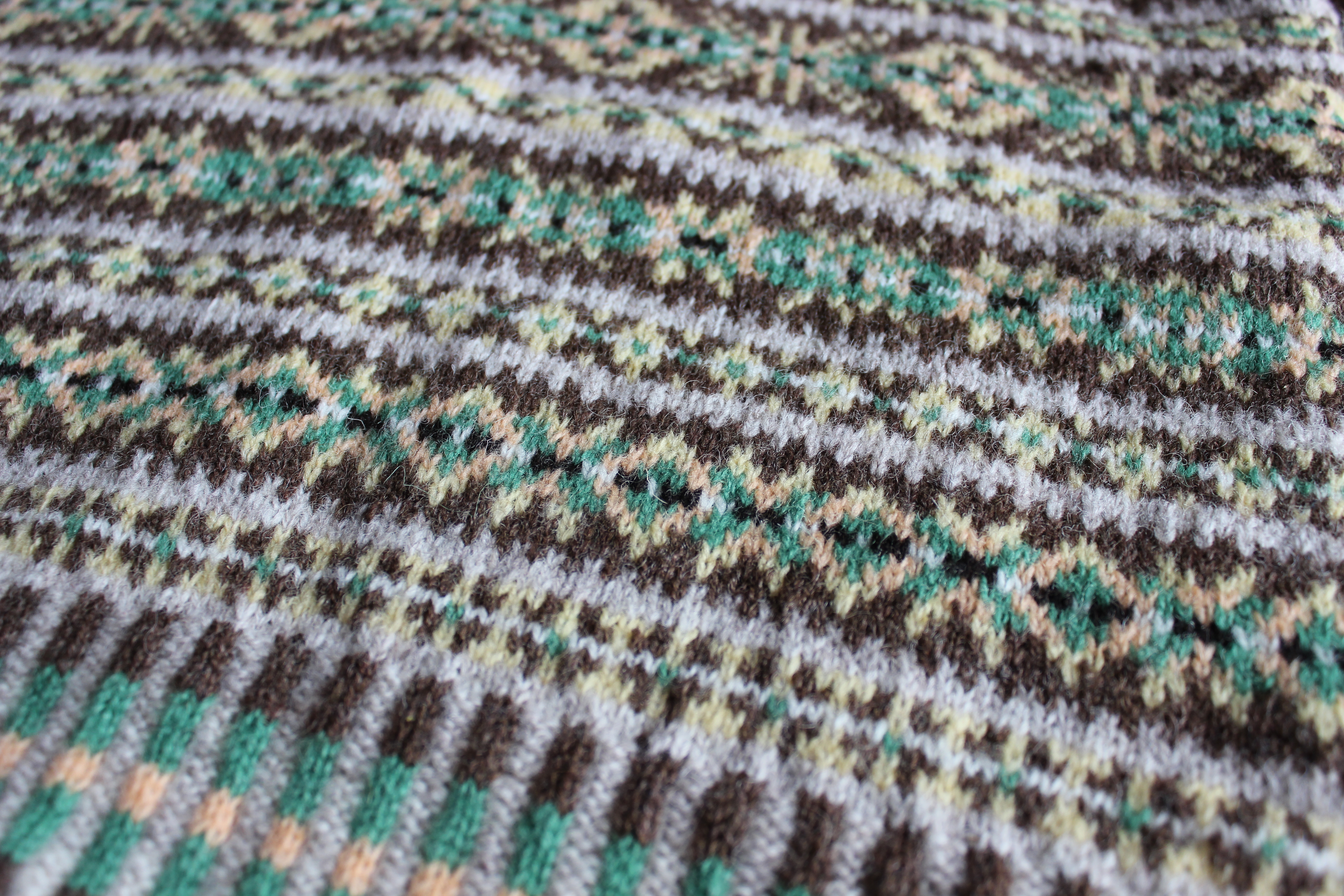 The next one is this snazzy little sleeveless number. It was actually labelled as a childs jumper, but it fits me fine! I don’t think its as vintage as the colours make it look  but perhaps it is, it seems to hardly have been worn. The colours are quite a typical matte selection of brights with naturals with that old favourite – Peach, it is one of those colours that, I think, you either love or hate in Fair Isle. I would never knit with it but I’m not against a bit of peach in my Vintage!