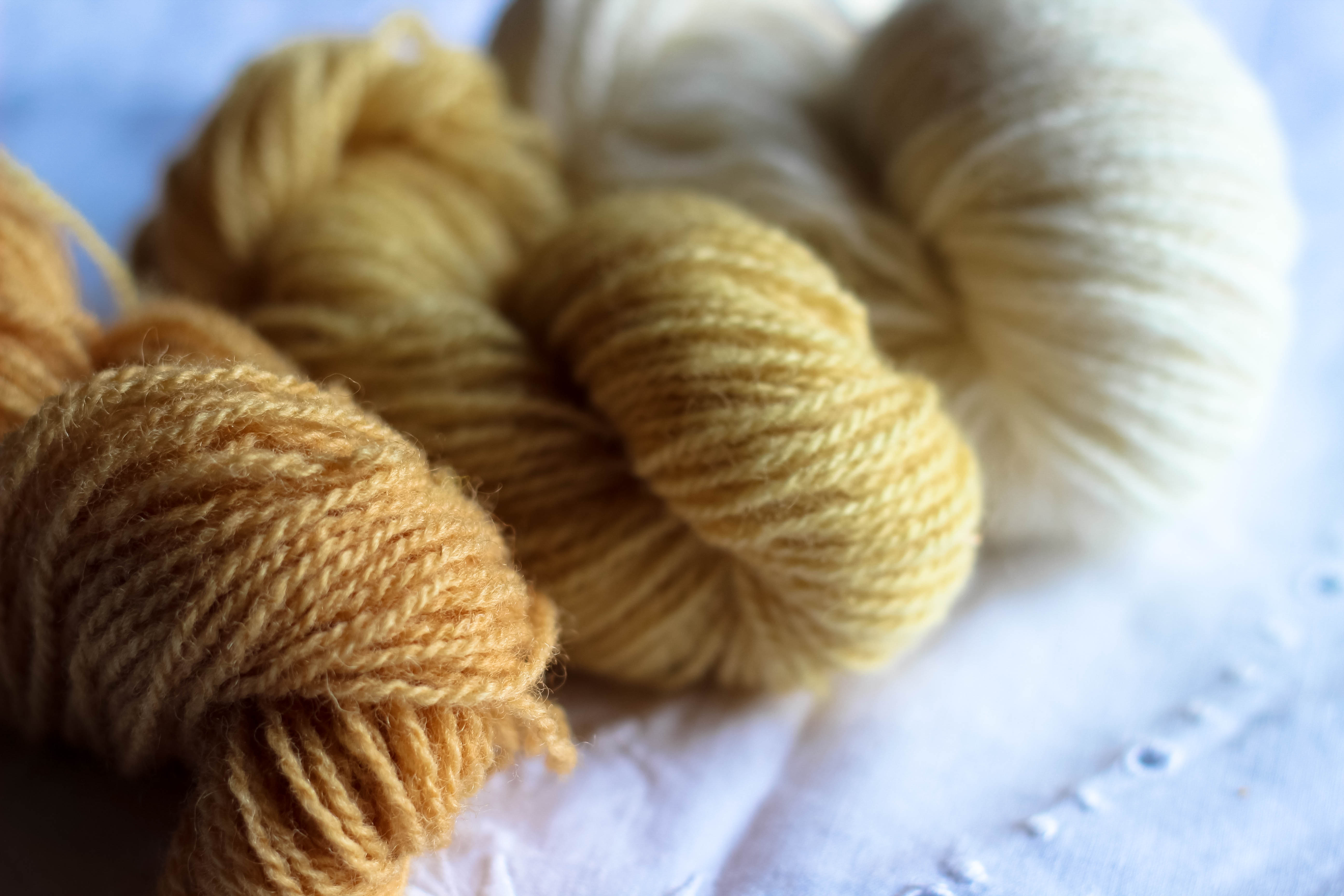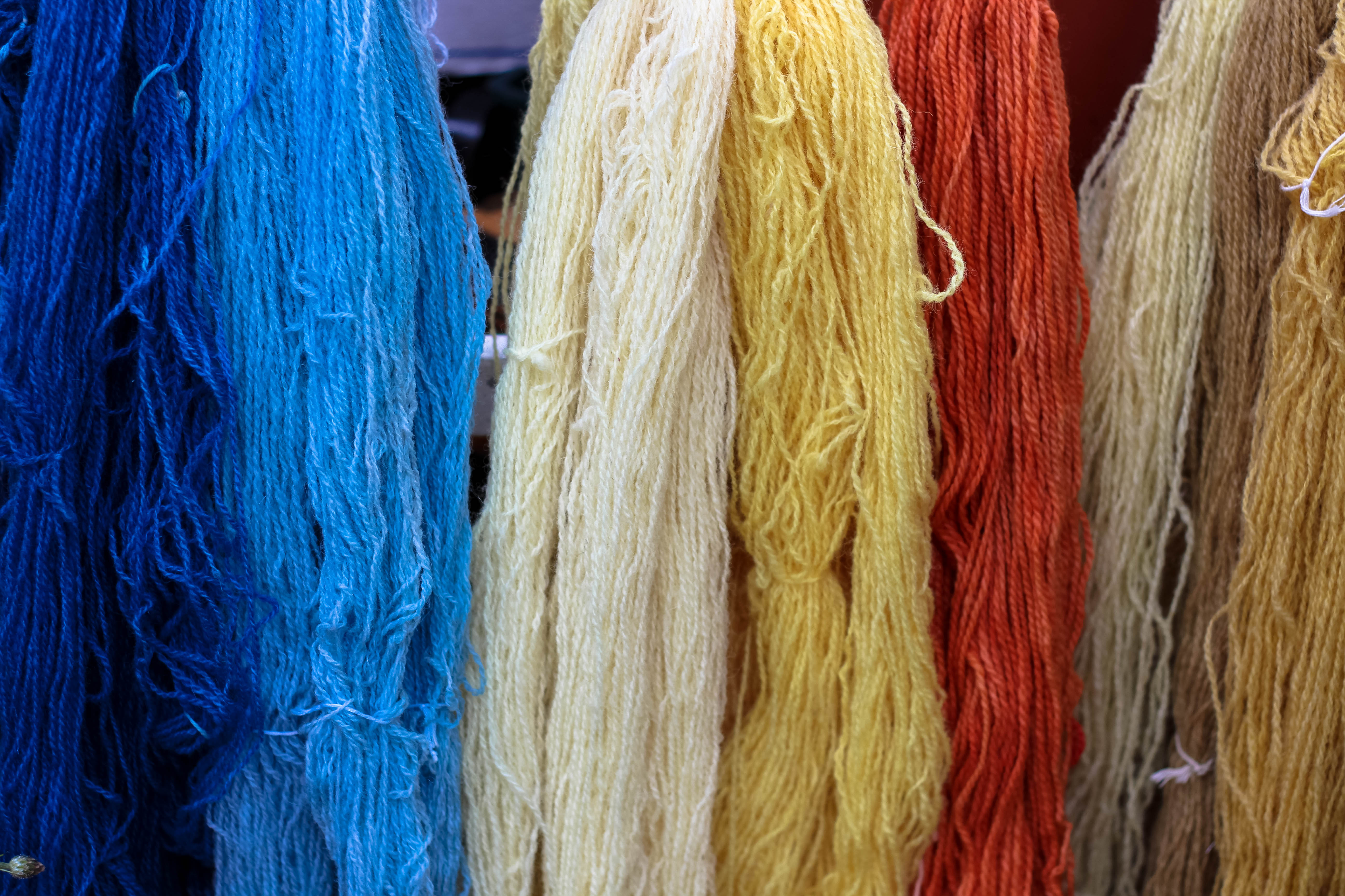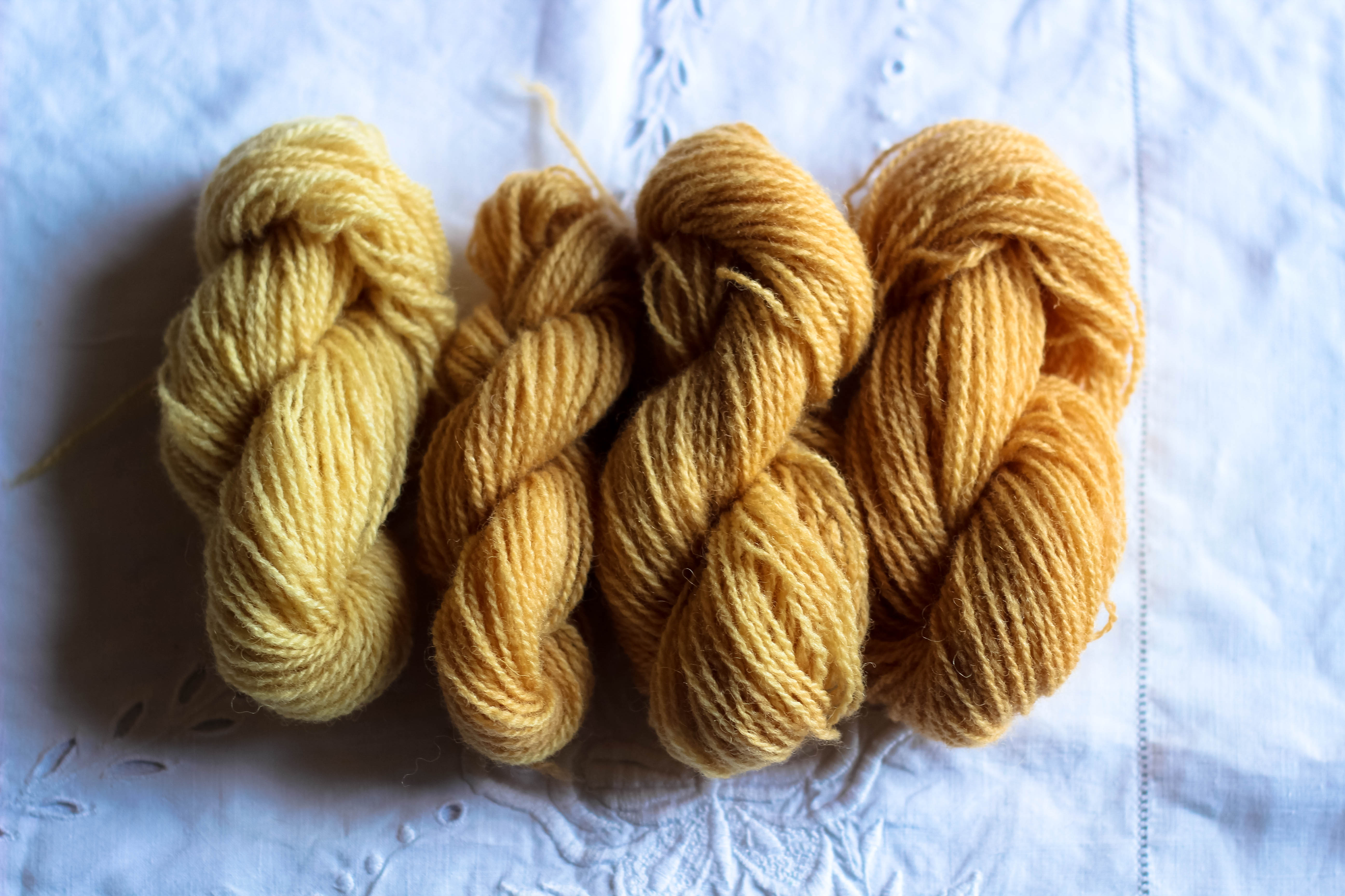 This is all the Supreme Jumper Weight hanks we dyed, the one on the left was dyed the least amount of time with the one on the right being in the longest