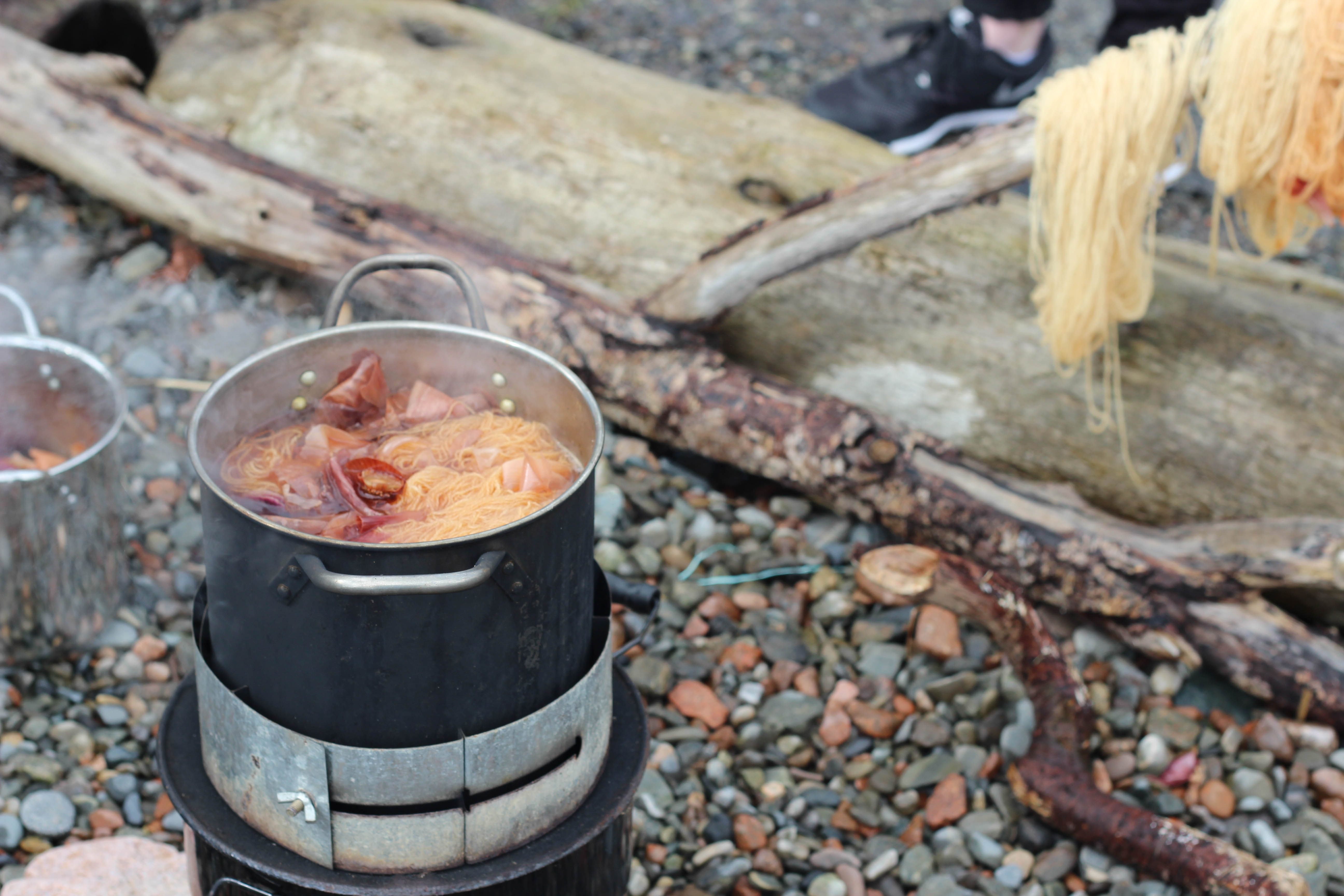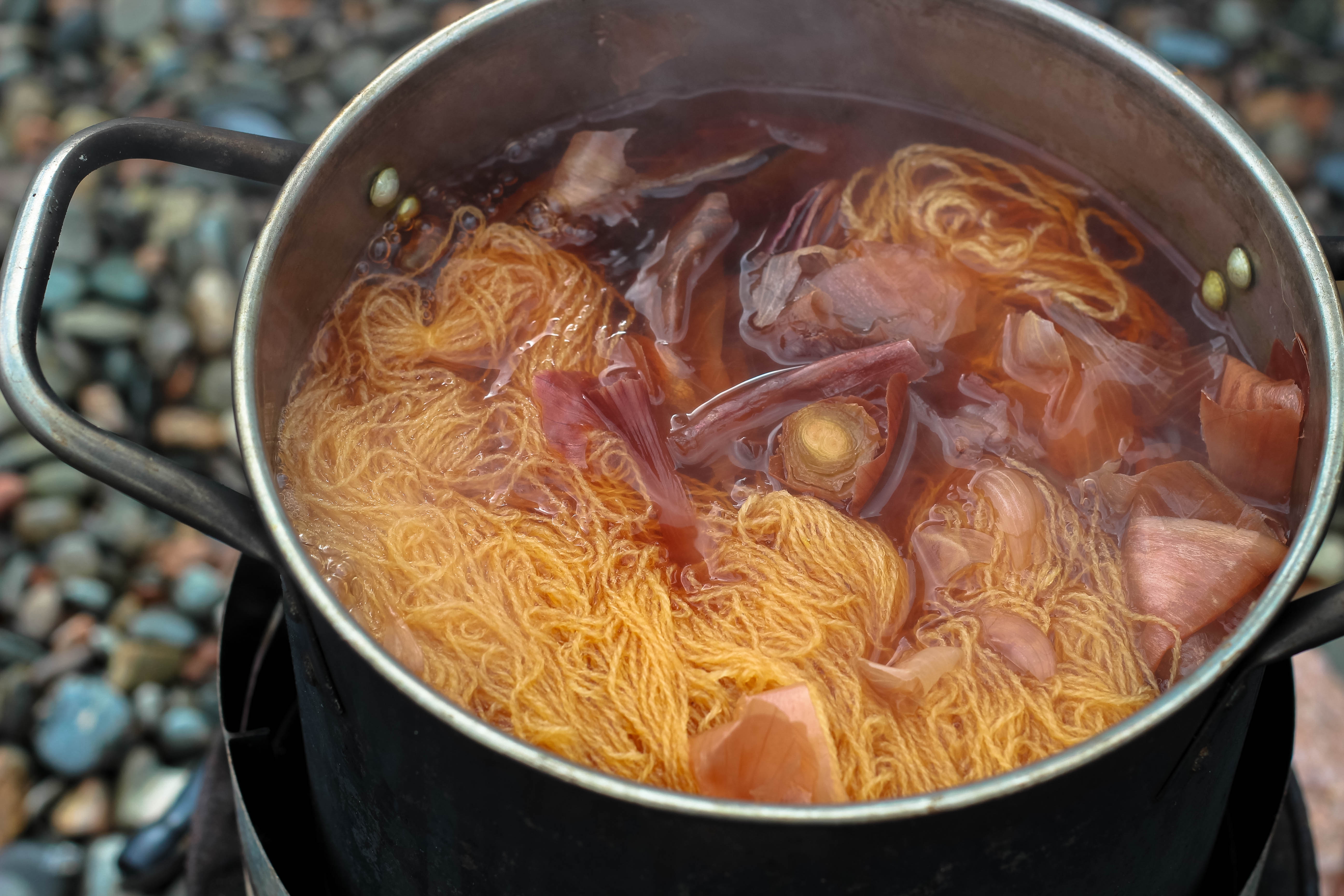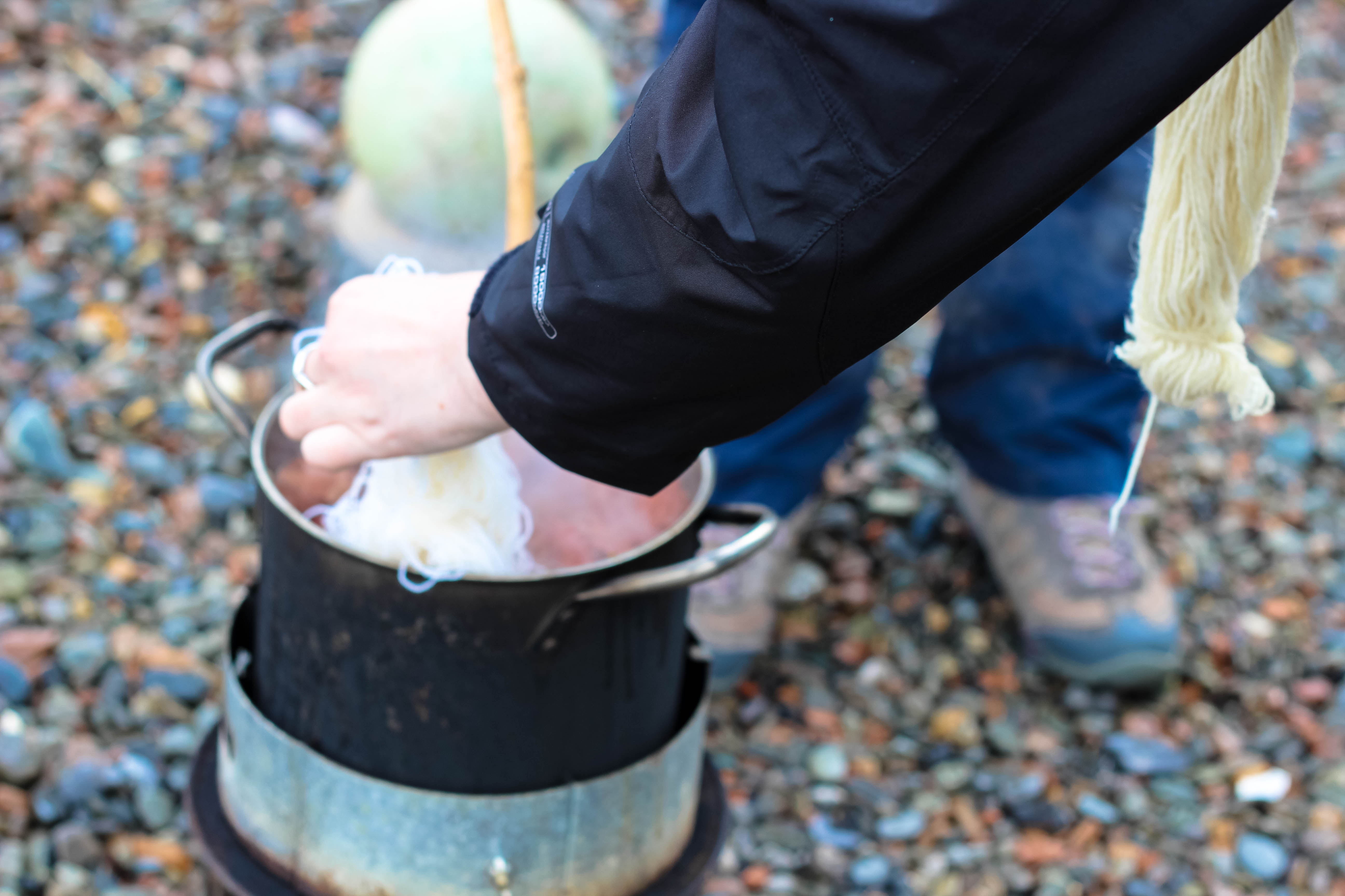 For our first time experiencing natural dyeing it was suitably ‘natural’, in a pot on a wood burner outside while we dodged into a shed to avoid lovely Shetland torrential rain showers. Bunchy of Spindrift Crafts was the one giving the demonstration and she explained to me and Amy a little about natural dyeing, we used Onion skins because its one of the easiest to use. She explained all about mordanting.. and other slightly complicated things about dyeing your own wool. (I plan on purchasing a book to try and understand it all a bit better..) but very quickly after a slight gas hob cooker explosion situation (no harm done) Me and Amy were preparing our yarn for dyeing!