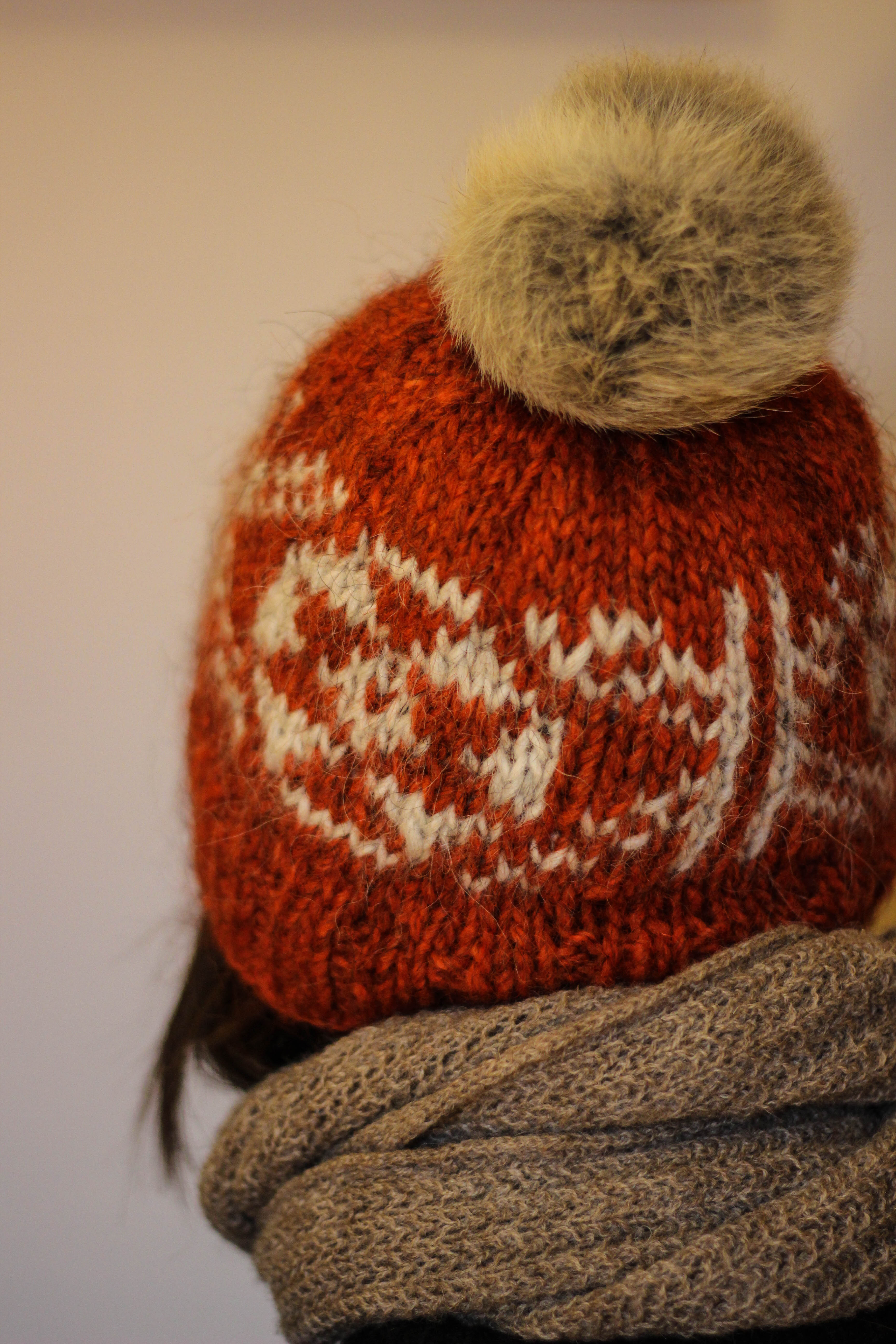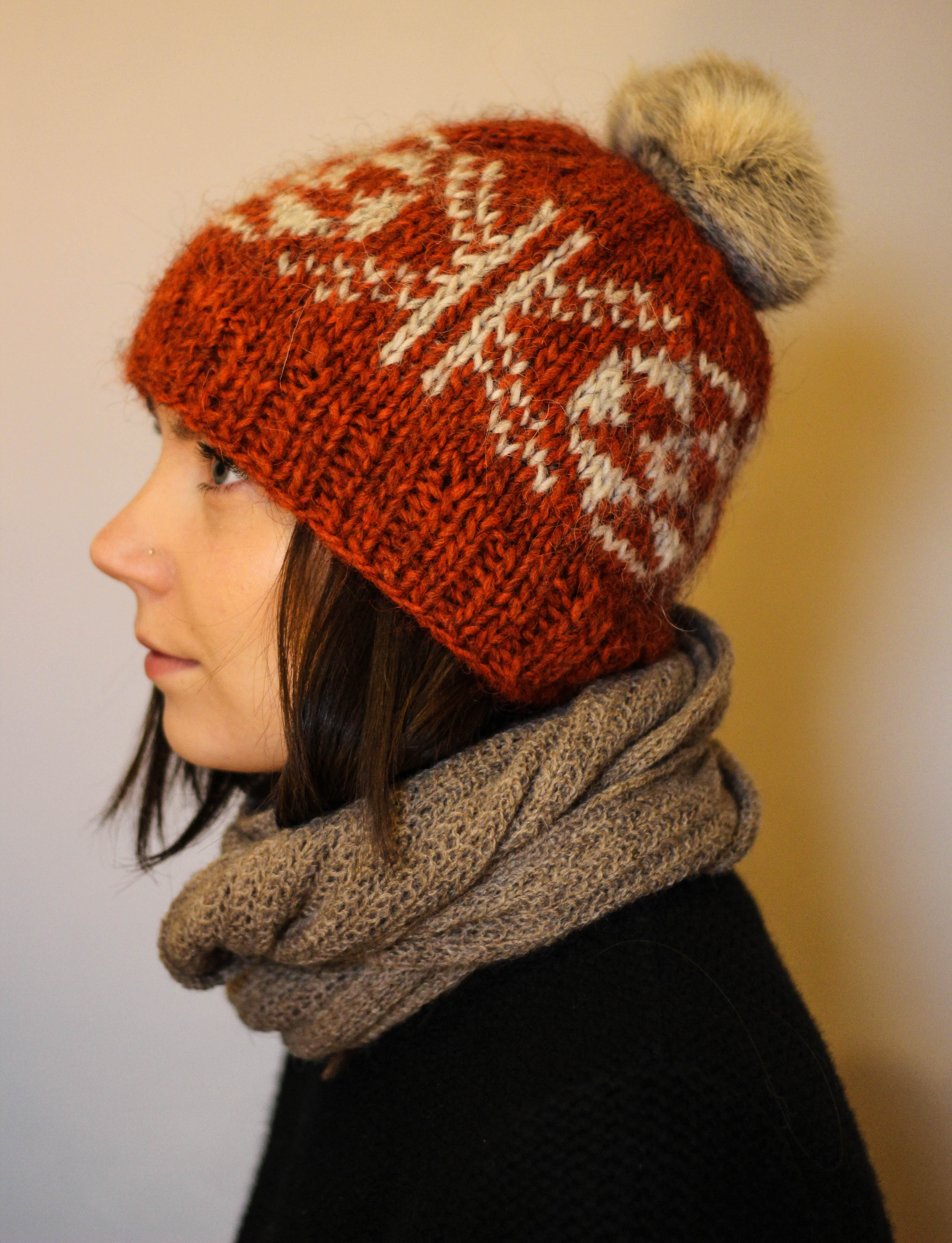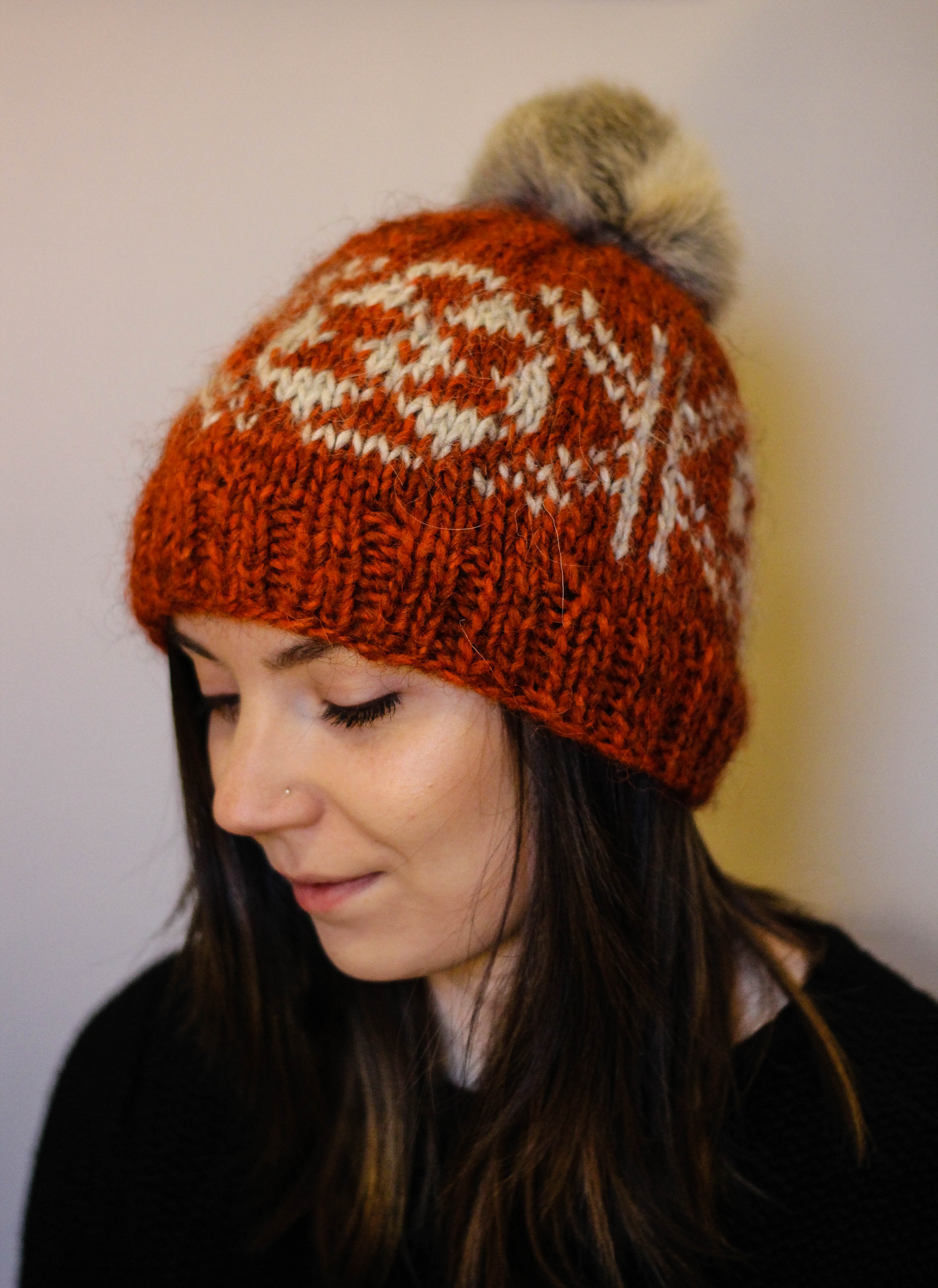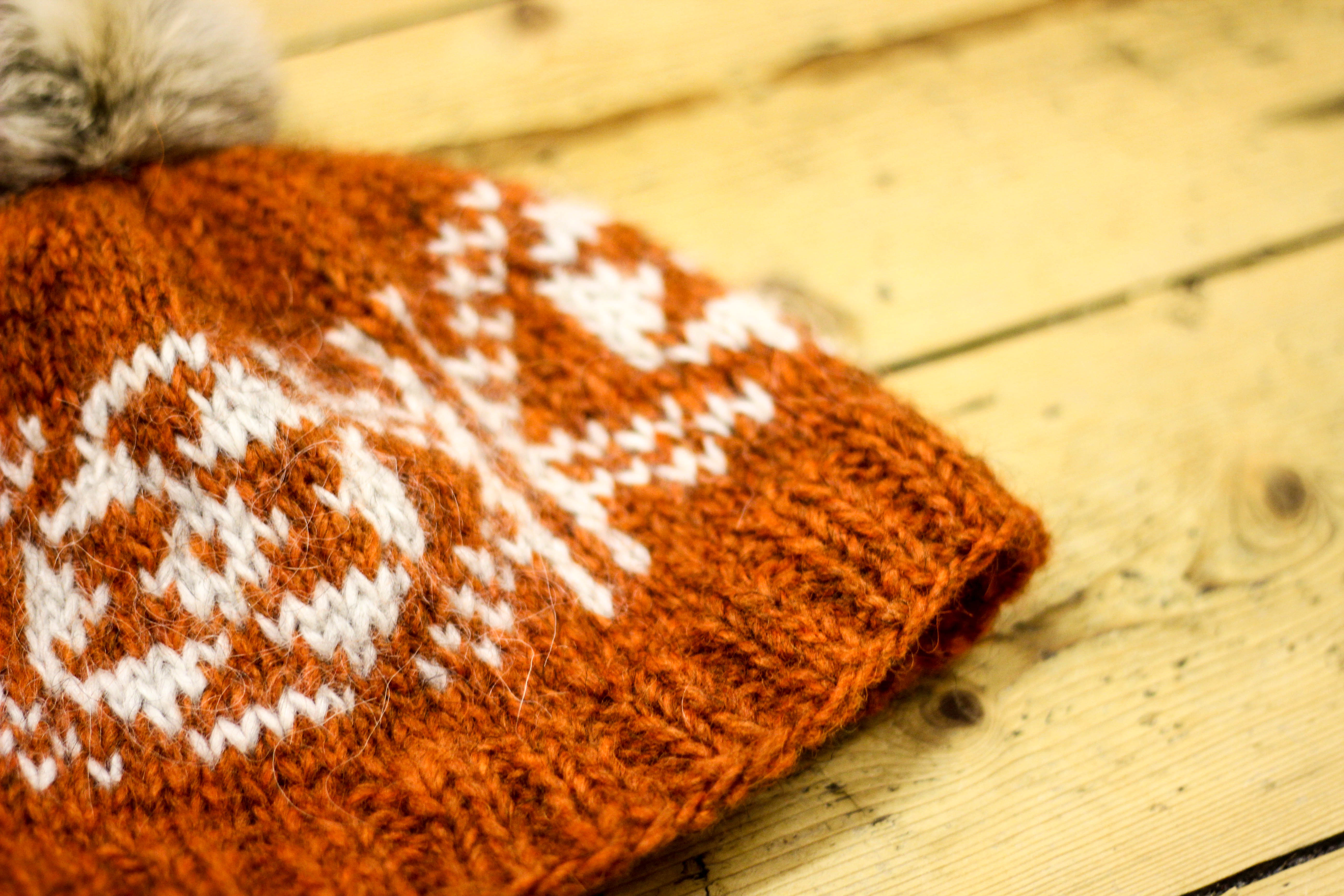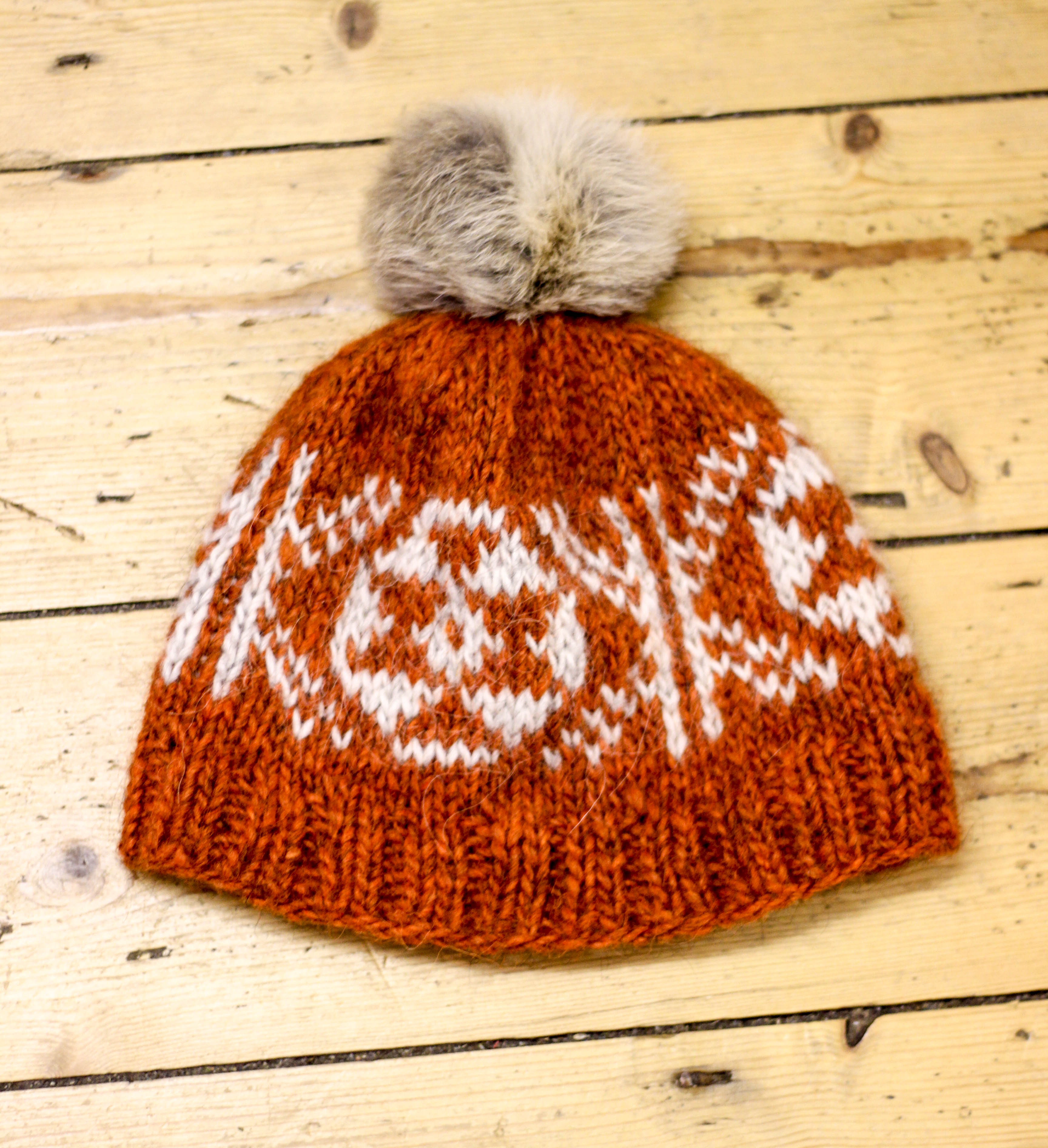 I had a look in my many Fair Isle books and decided upon this motif from Sheila McGregors ‘Complete Book of Traditional Fair Isle Knitting’ and I’m very pleased with how striking it is in chunky wool. I used Alafoss Lopi, in burnt orange and ash heather and it is so warm! I sewed on this Pom Pom from my collection of accoutrements but its totally optional of course.