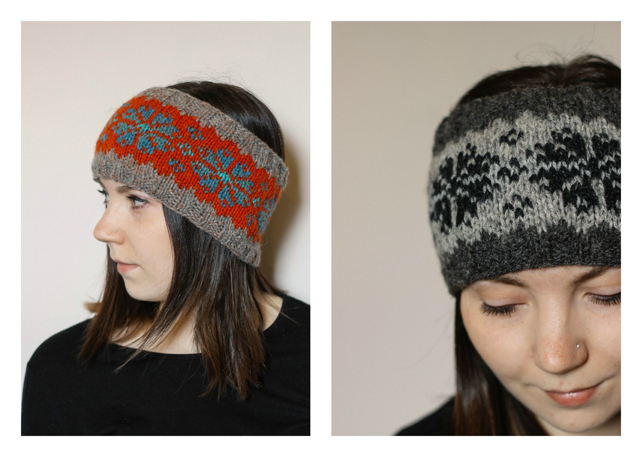 I knit the headband using two strands of J&S 2ply Jumper Weight held double for a light aran/DK weight. I did a subtlety shaded version using 5 colours and also a 3 colour version. I think it came out really nice and I love how the different colour schemes work.