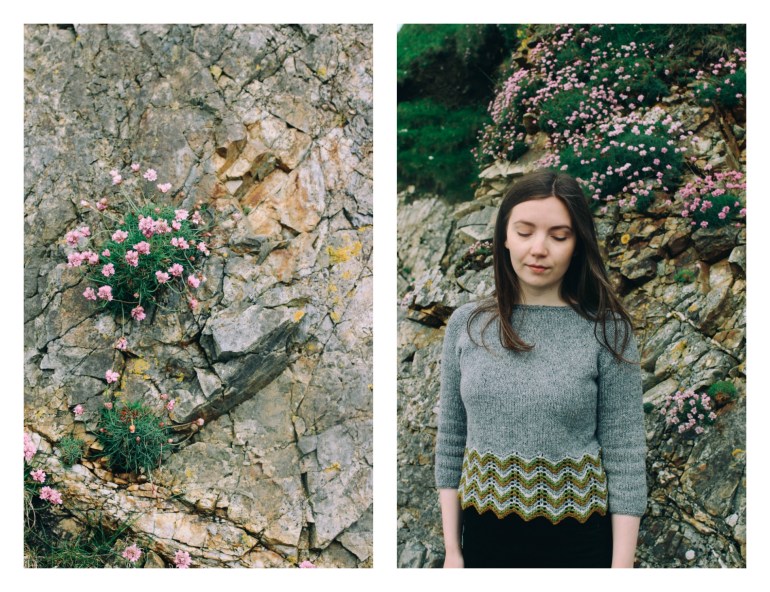 8. what a simply elegant sweater…the overlapping grasses above you, like the lace of the sweater, and the sea pinks, oh, how beautiful against the dark green…a sea of inspiration–no pun intended. I would try those colors for my sweater, pink and gray or pink and dark green. Your designs are super!