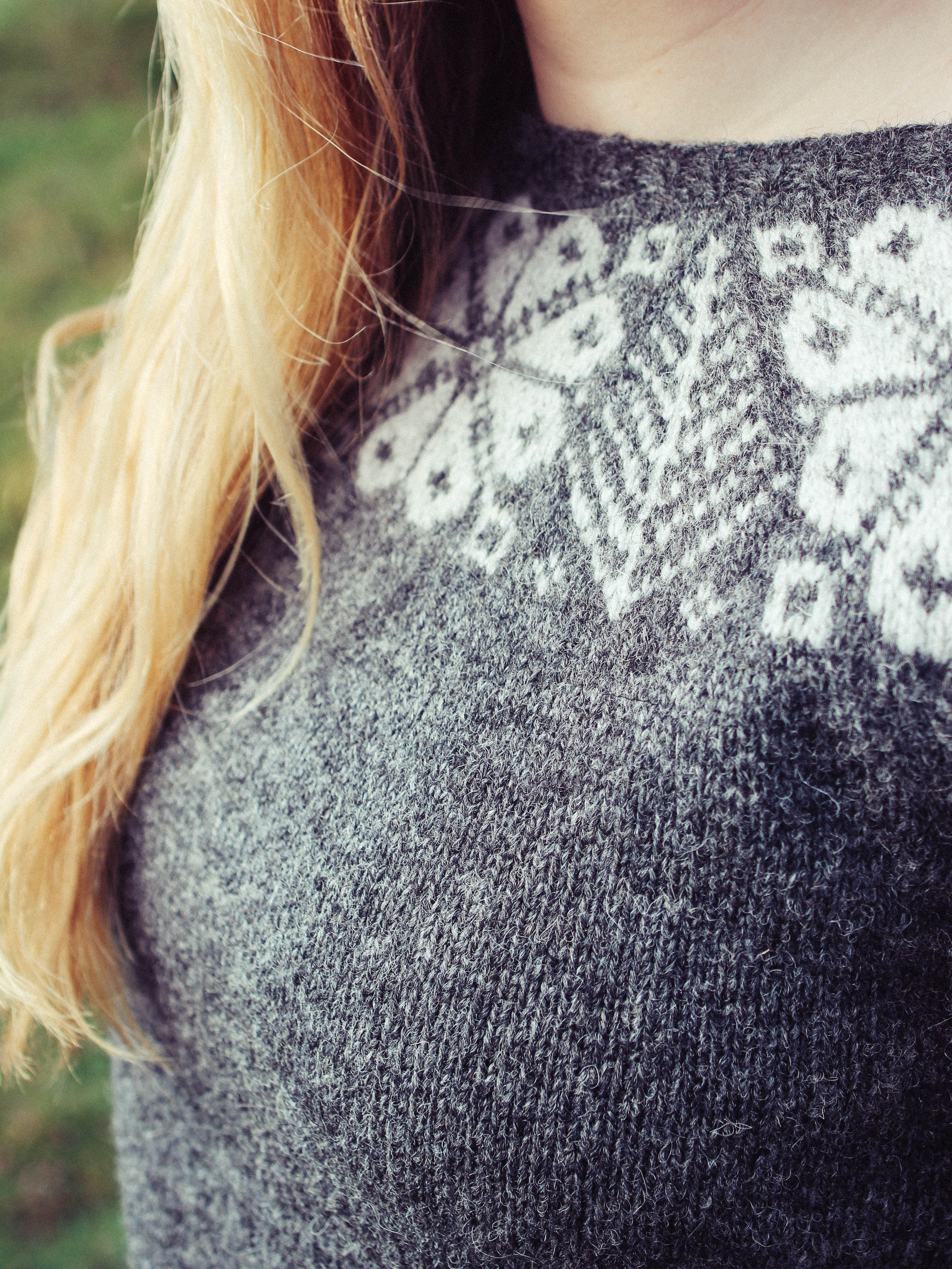I used J&S 2ply Jumper Weight in shade 54 for the main shade and Brooklyn Tweed Loft in Snowbound for the yoke, Snowbound is a nearly white light grey so I knew the contrast would be really good and it would stand out.