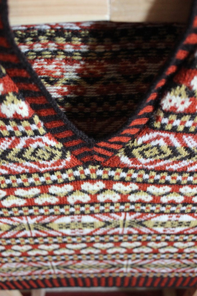 This one also came from eBay but is much newer – made and bought within the last 10-15 years for sure and is actually still available from Anderson & Co another long time Shetland knitwear seller. I can tell you I definitely didn’t pay £200+ for this though – I think I got it for £20..! But I think it is an excellent example of a modern made version of this style. The colours are the same and motifs are similar although they are smaller and have more bands, it sits very well with the other two.