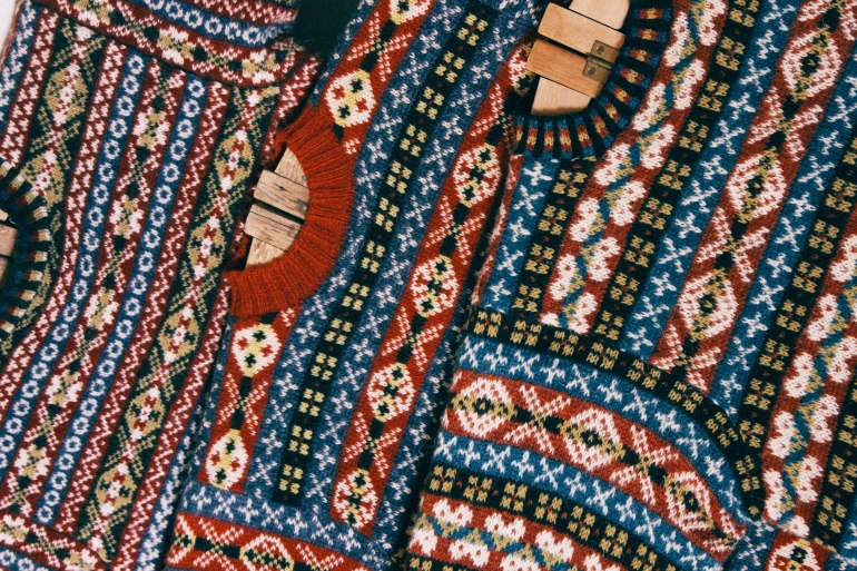 Anyway, what started this thought process was the above two jumpers. I got them from eBay late last year – they actually arrived on the same day which I hate. When I’m eagerly awaiting a new second-hand purchase I love the excitement of opening the parcel and when you have more than one that really dilutes the appreciation BUT that says more about my addictive tendencies than anything else. (as an aside, I’m making a big effort to only buy second hand these days which for a former fast fashion addict is very difficult so these parcels have come to mean more to me than ever..#saddo) Although purchased from eBay they are both from Shetland originally – the left is TM. Adie and the one on the right is a Shetland from Shetland – only known by the labels and both brands which sold Shetland knitwear, T.M Adies, in particular, was a very prominent brand which created all kinds of textiles. I decided to wash and board them both on Thursday as they both needed a freshen up, only when I put them on the board did I notice the number of similarities in them. You can see certain motif’s and colour placements are exactly the same and the addition of the sections with the hearts and the corrugated ribbing are the only difference on the Shetland from Shetland one. One thing I love about Fair Isle is that you can see the basque and ribbing detail makes a huge difference to the overall colour ‘feeling’ of a garment. To me the ‘main’ colour of the one on the left is red and the one on the right is shetland black just because that’s what the background of the ribbing is.