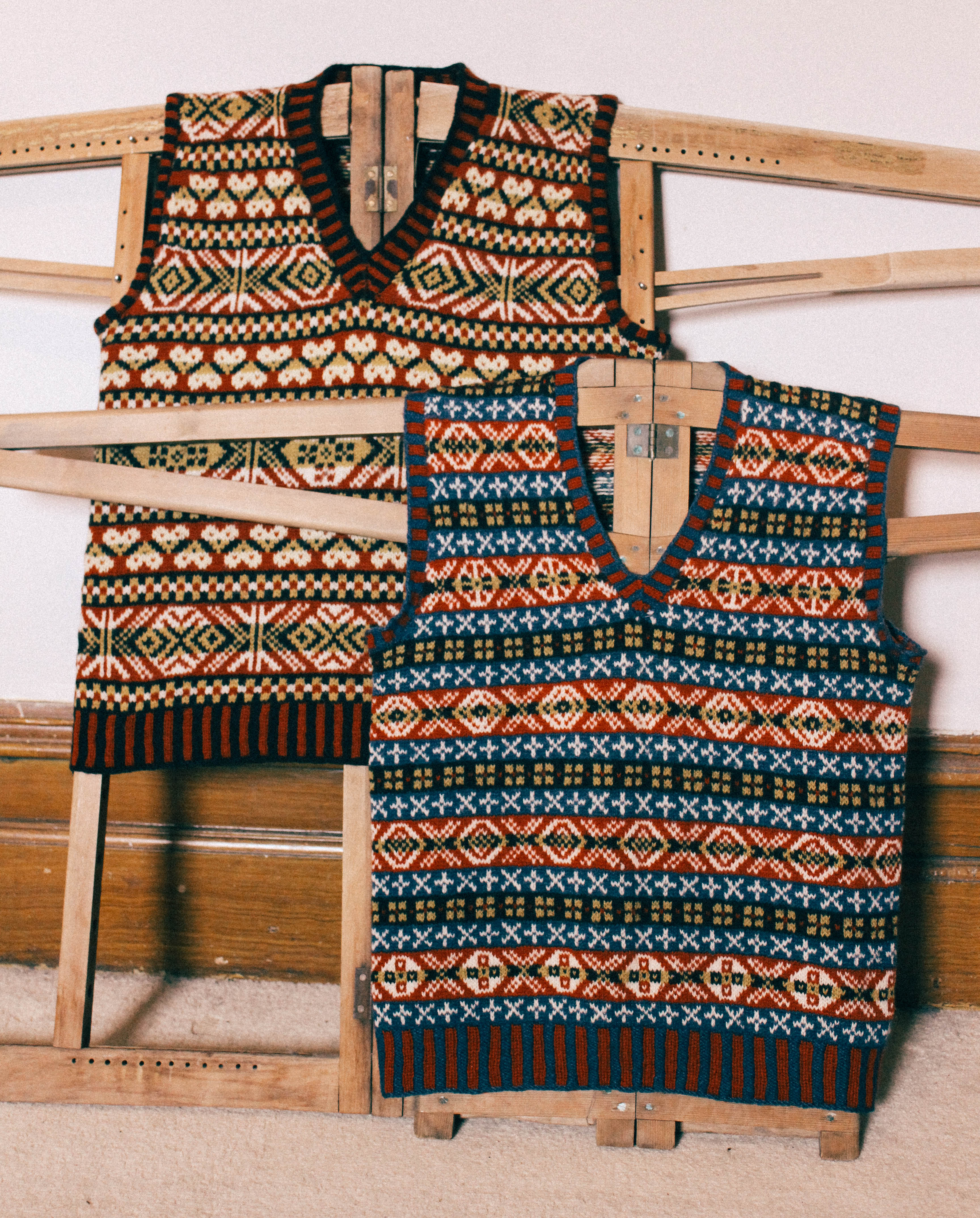 Again though they are both so striking. The blue and red ribs on the right again makes it feel like the main colour is blue – to me at least. You can see how if you had these motifs in your arsenal (all of them can be found in Shetland knitting books with pattern sections) you could endlessly make successful garments. The colours could be switched out for different ones and as long as you follow the same values in colours it would work. The one on the left looks that bit different without the blue and comes across more graphic to me with the bigger motifs.