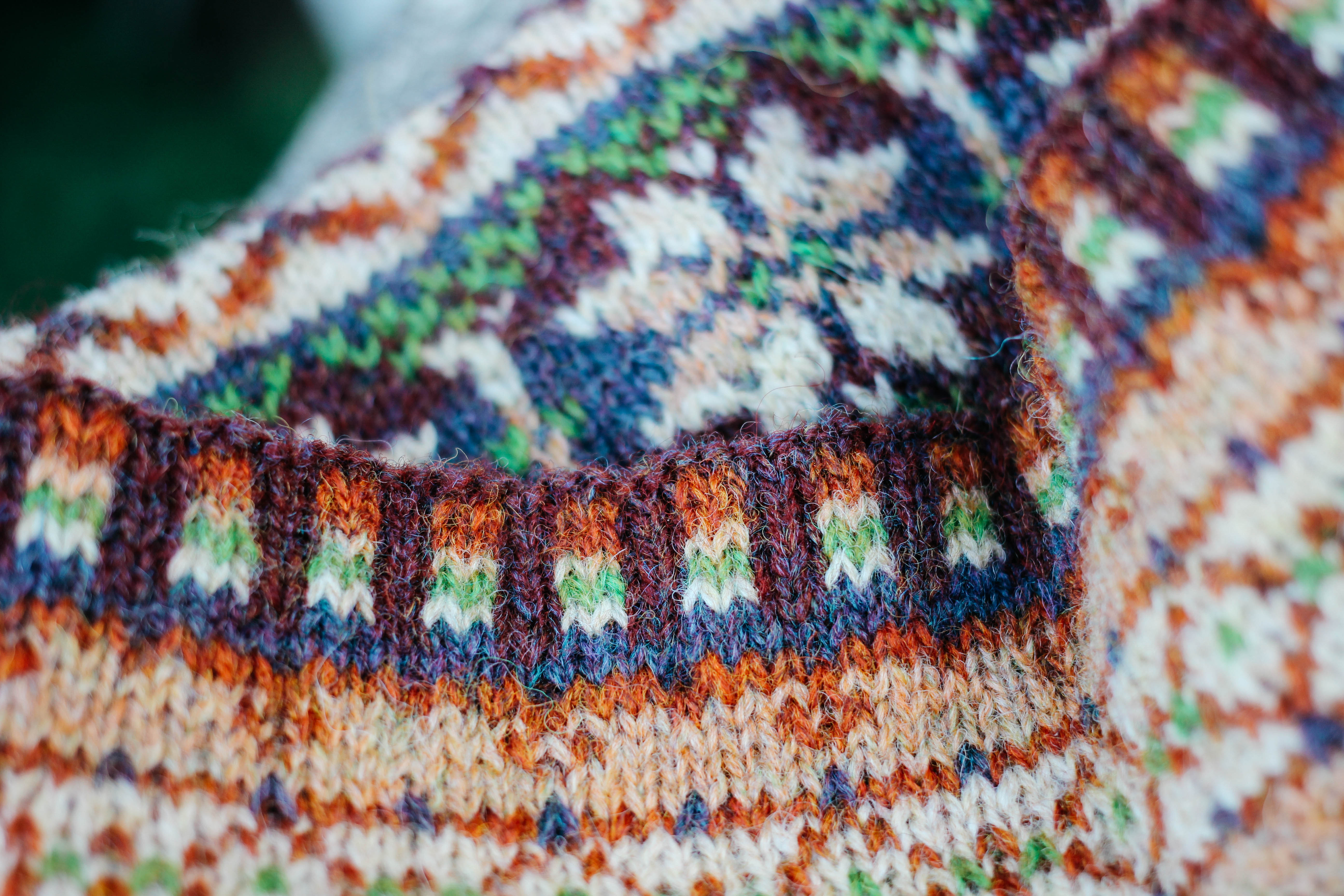 The colours I chose in 2ply jumper weight were from l-r: 1281, FC43, FC11, FC38, FC55 and FC14 which ended up working great! I didn’t knit a swatch but I chose my colours by roughly following the tones of the original shades as follows –