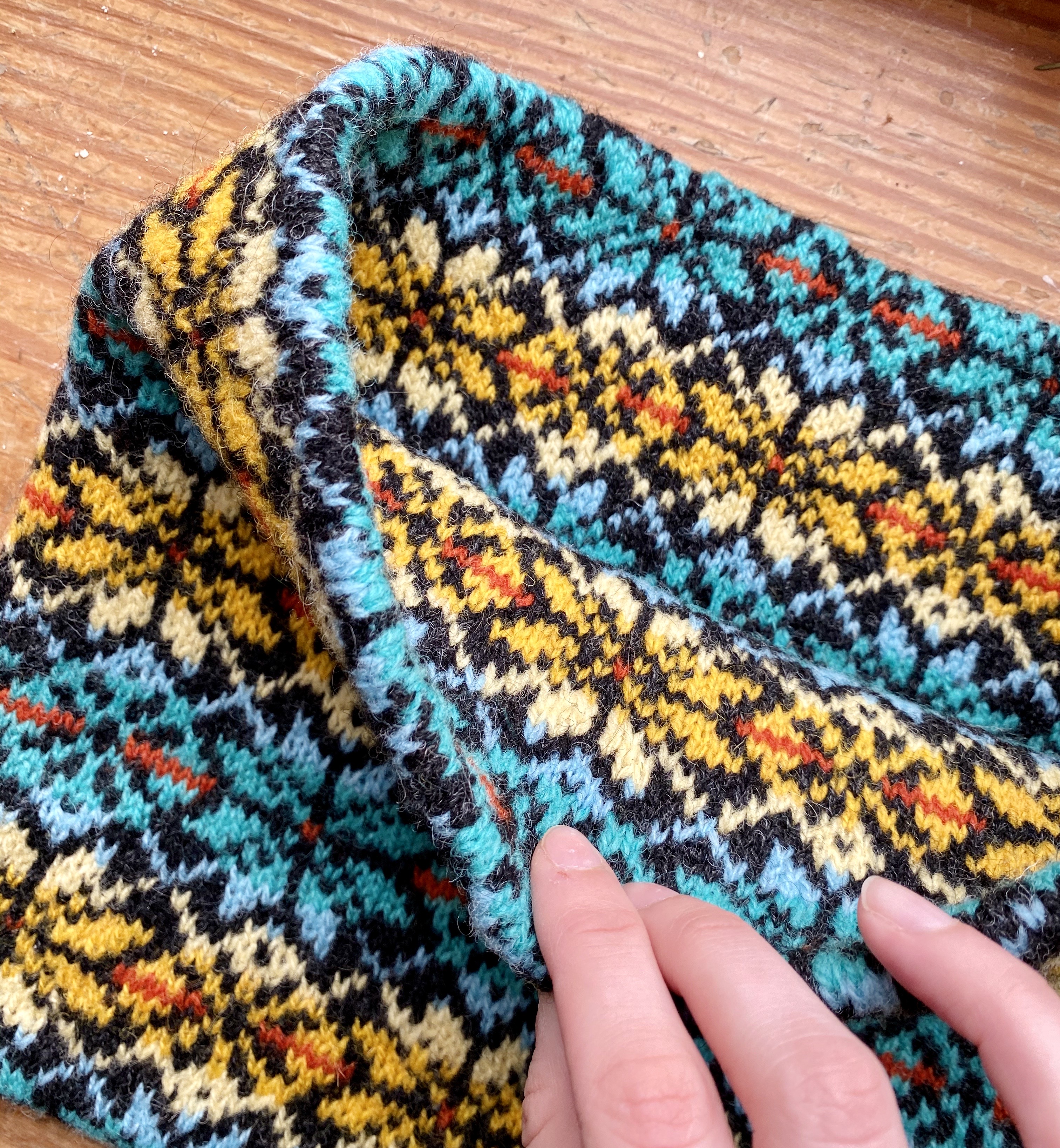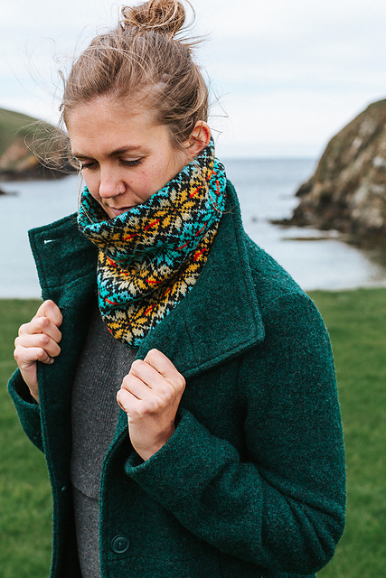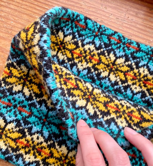 I used 2ply Jumper Weight (shock horror.. not) in shades 81 (charcoal) for the background, 91 and 66 (yellows), 125 (orange), 71 and 75 (blues) in a shaded pattern onto my own allover motif, it took me a while to put this motif together and it takes a lot of fiddling to balance this kind of motif well within itself and then as an allover pattern. Quite often I do a swatch, take a photo of it then repeat it on an app to ensure I dig it. I wanted to do a double cowl for maximum warmth so you provisionally start it, knit so many repeats then switch to a peerier needle for the inside then graft the beginning and end together giving you a seamless funnel tube!