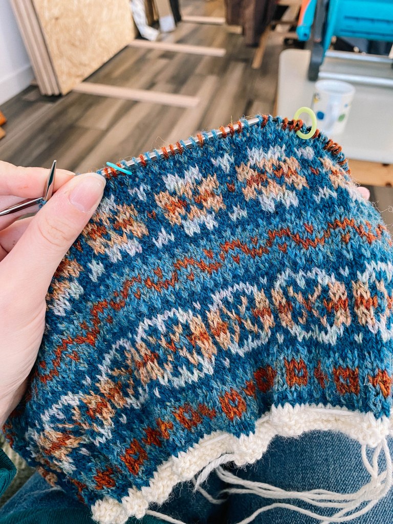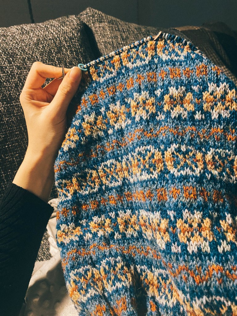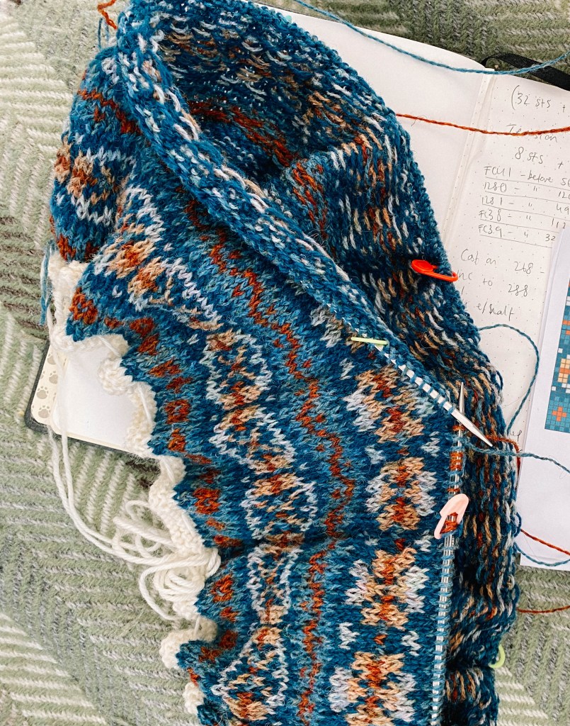 I was asked firstly to design a garment – usually, I design accessories or yokes, all-over Fair Isle is not my customary design style mainly because of how hard it is to do a pattern in multiple sizes. But I decided after knitting a few tank tops last year that I was willing to give it ago, I also was asked to use these kinds of colours.. ie blues and rusts. I almost always instantly regret agreeing to certain colours because one of my unfortunate personality traits is hating doing what I’m told.. but anyway I persevered.
