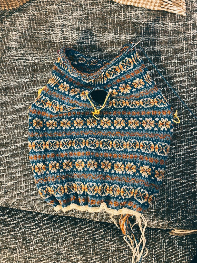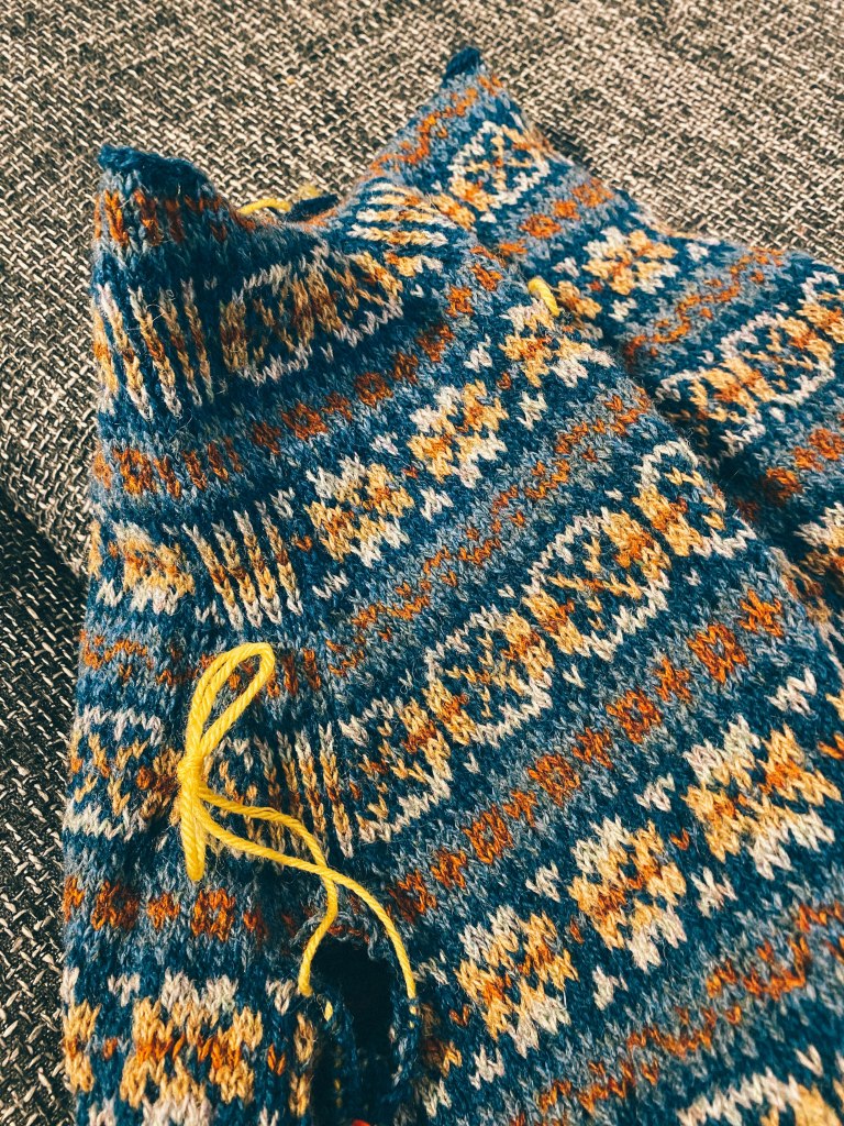 This sample was knit in January/February 2021, which seems so long ago now.. hence the dark and gloomy pics, soon I was adding my steeks for the arm and neck holes, once I get to this stage I usually start knitting really fast… wanting to get to the next stage and feeling the end in sight!
