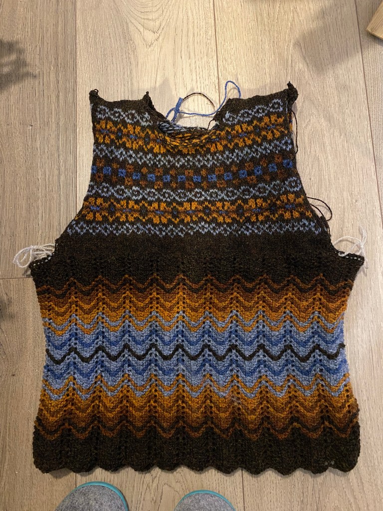 Then I just worked as written, inserting steeks for the arm and neck holes, it was a nice project that kept my interest – something I need when I’m distracted by life as I permanently seem to be at the moment! Here you can see it finished before cutting the steeks and then after: