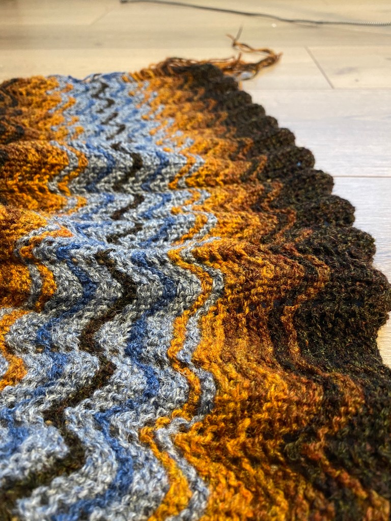 The blues and golds/oranges together are perfect here. Kudos on the edging. A striking garment! (This is one of the books that has caught my eye recently – right up my alley, too.)