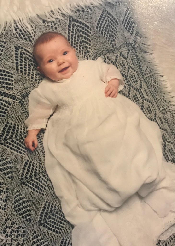 So even me, a child born in Shetland in 1990, had a Hap. It was made for my sister by a lady who was friendly to my mam’s side of the family in Northmavine. Two of the same Hap (maybe many more – it might have been ‘the’ Hap she made for people) were made for us, the first one for my cousin Aileen – which was also used for her sister Nicola then another for my sister Marianne and in turn used for me.