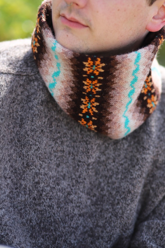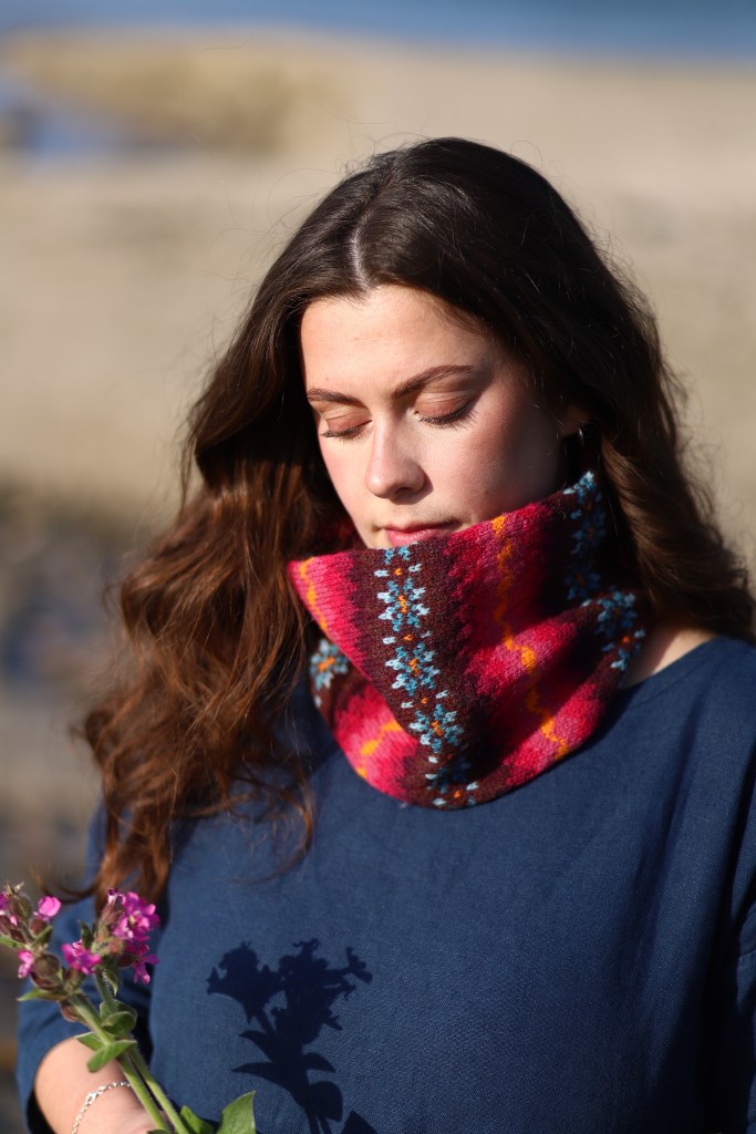 This style is so classic to me, it makes the transitions between bands of motifs much more gentle. So when it came to working on my design I decided to take this style which can seem ‘dated’ (to some..not me!) and put it on a cowl which in the context of Shetland knitting is a more contemporary style: